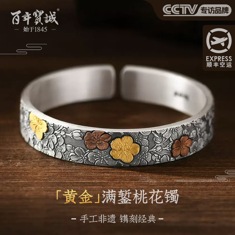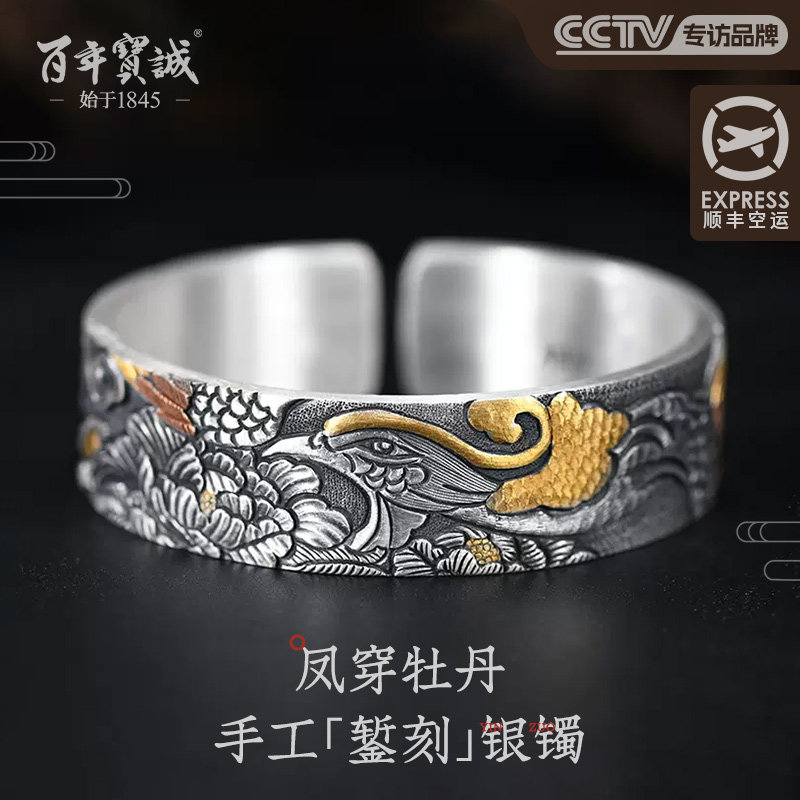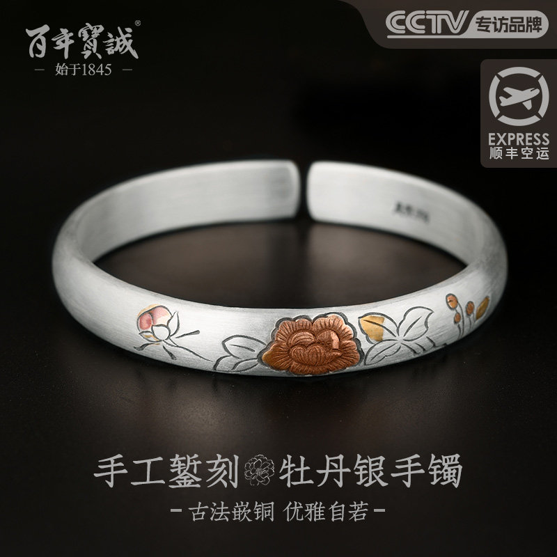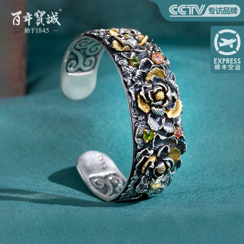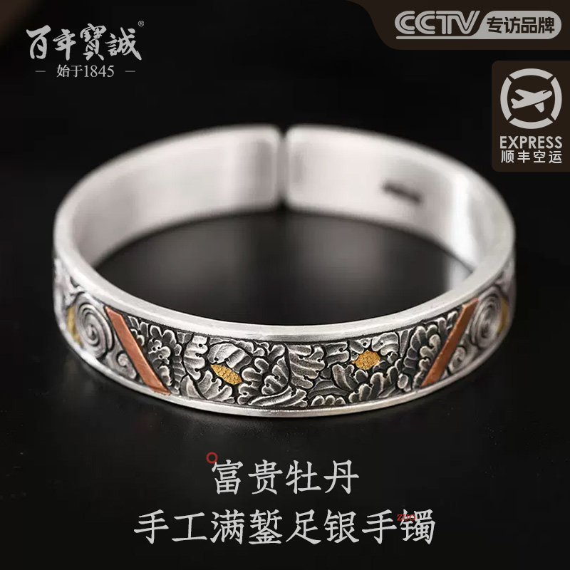 百年宝诚古法银错铜足银手镯镶嵌碧玺做旧民族风牡丹花镯子开口款