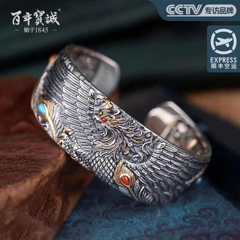 百年宝诚古法银错铜手工錾刻足银凤凰银手镯民族风镶天然美松南红