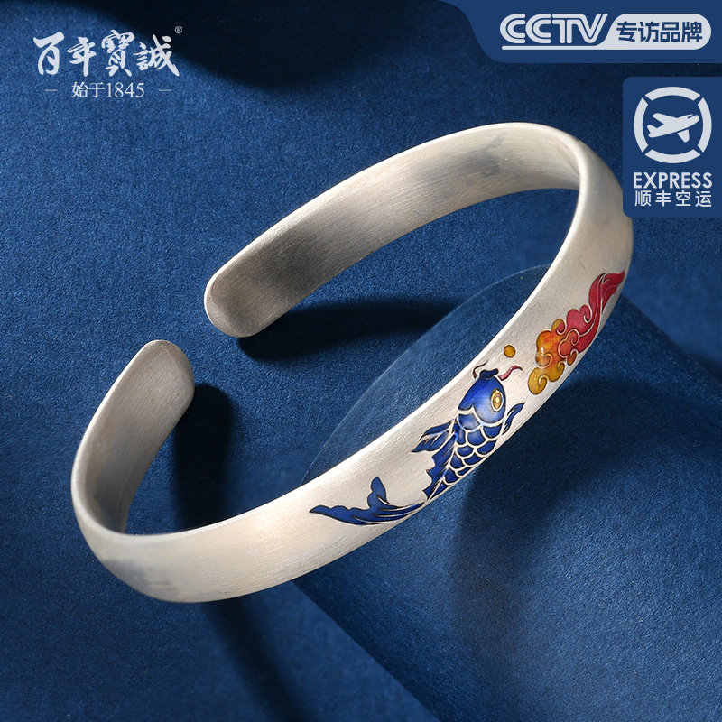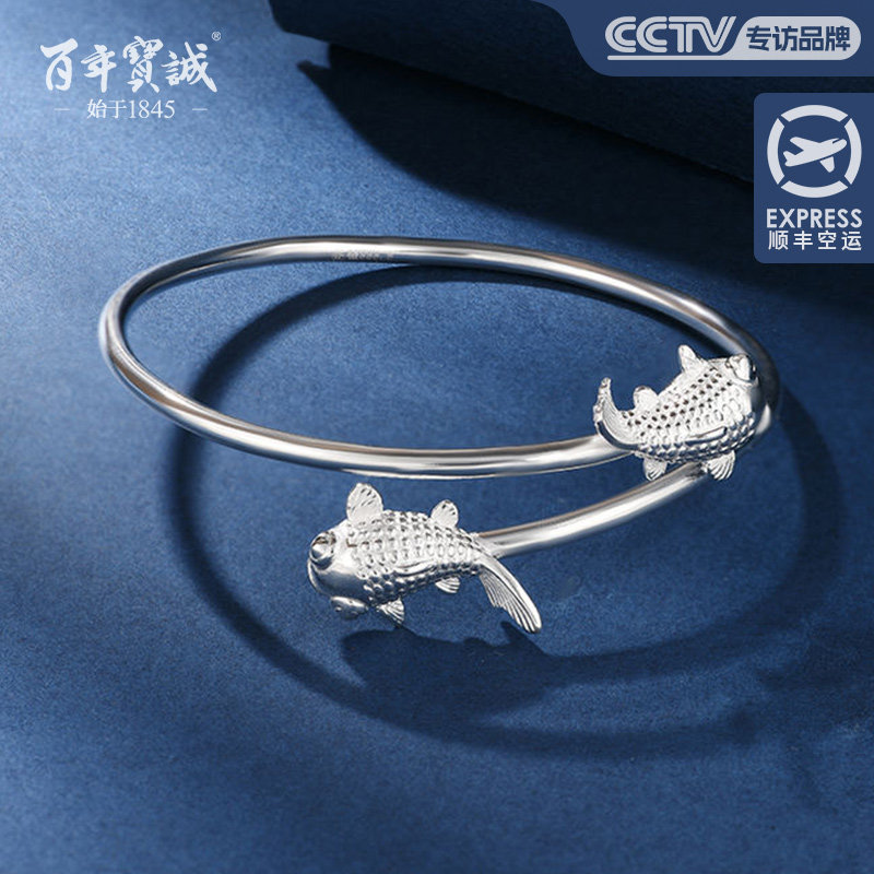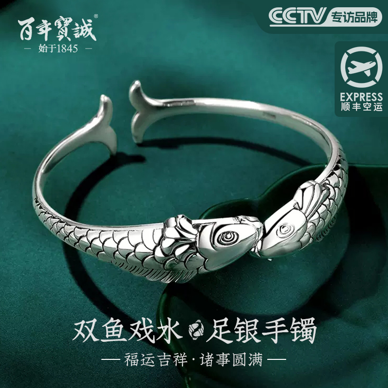 百年宝诚双鱼银手镯叠口纯银手镯999古风国潮时尚女款细足银手环