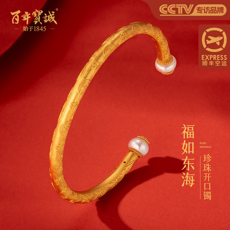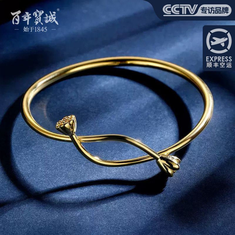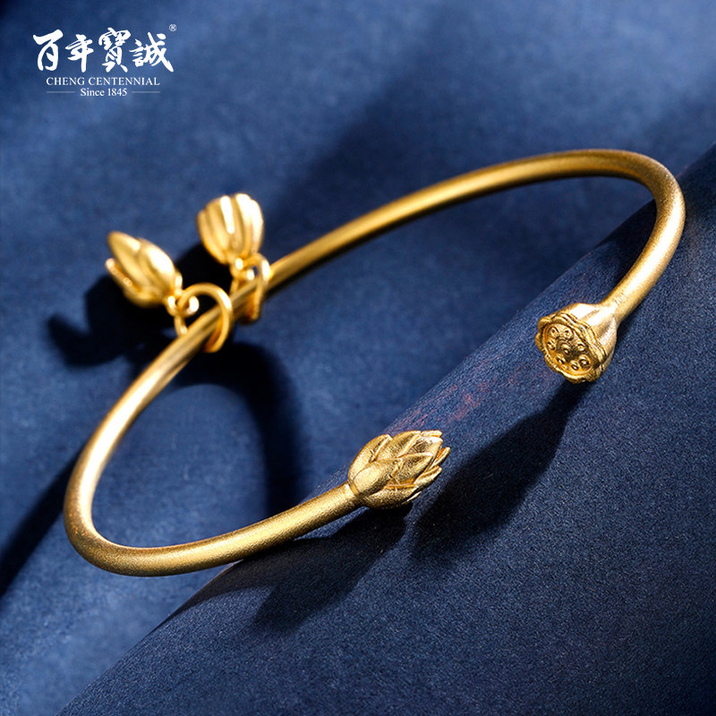 百年宝诚古法金手镯女士开口年轻款镯子简约设计莲蓬女友生日礼物