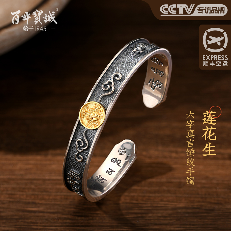 六字真言纯银手镯非遗手工錾刻莲花生做旧复古银鎏金男女纯银手环