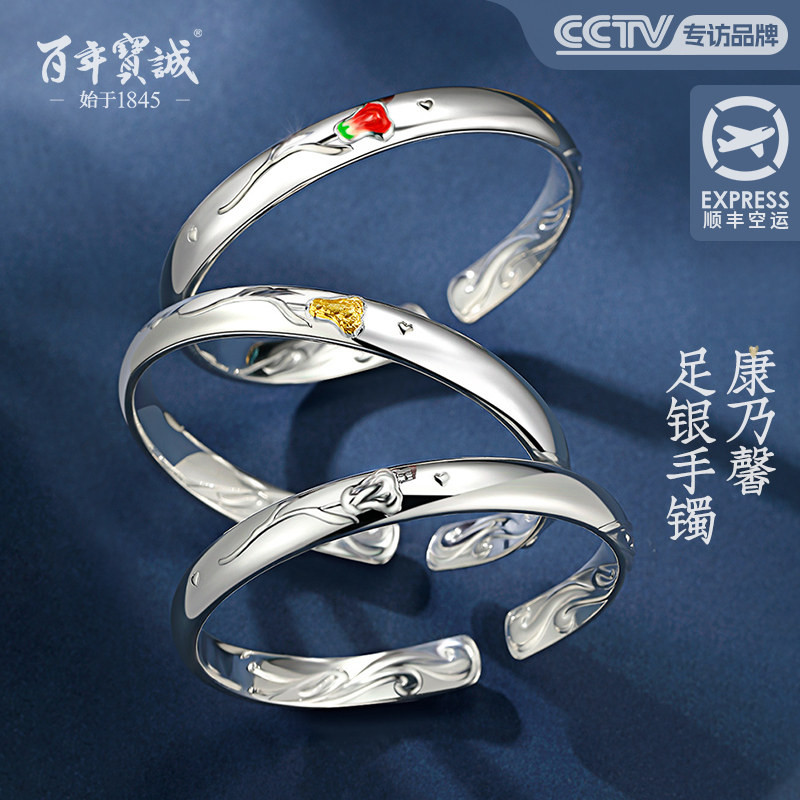 百年宝诚玫瑰花银手镯女纯银年轻款999足银镯子小众时尚简约银饰