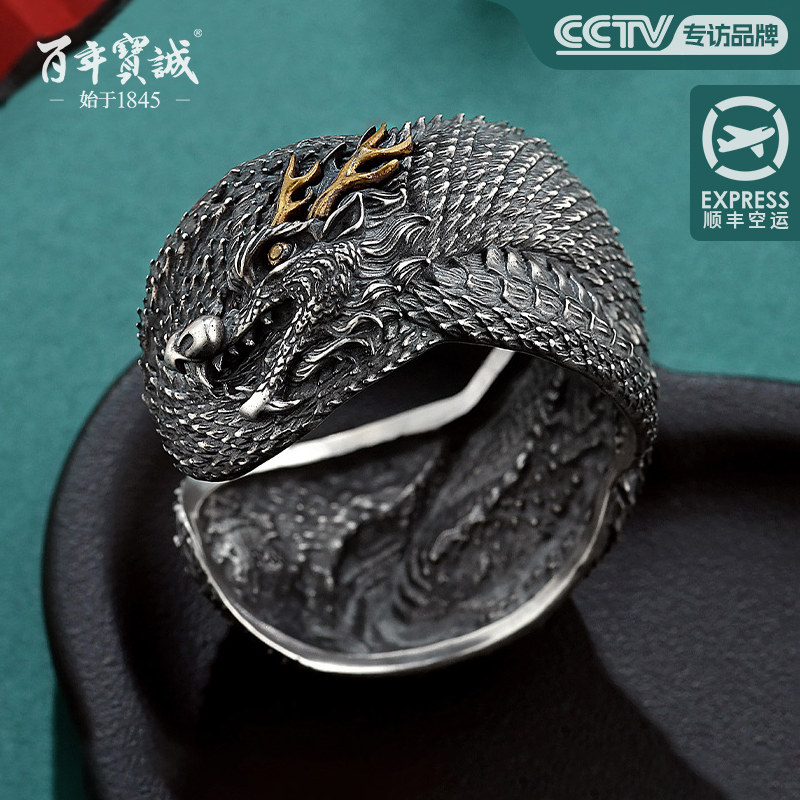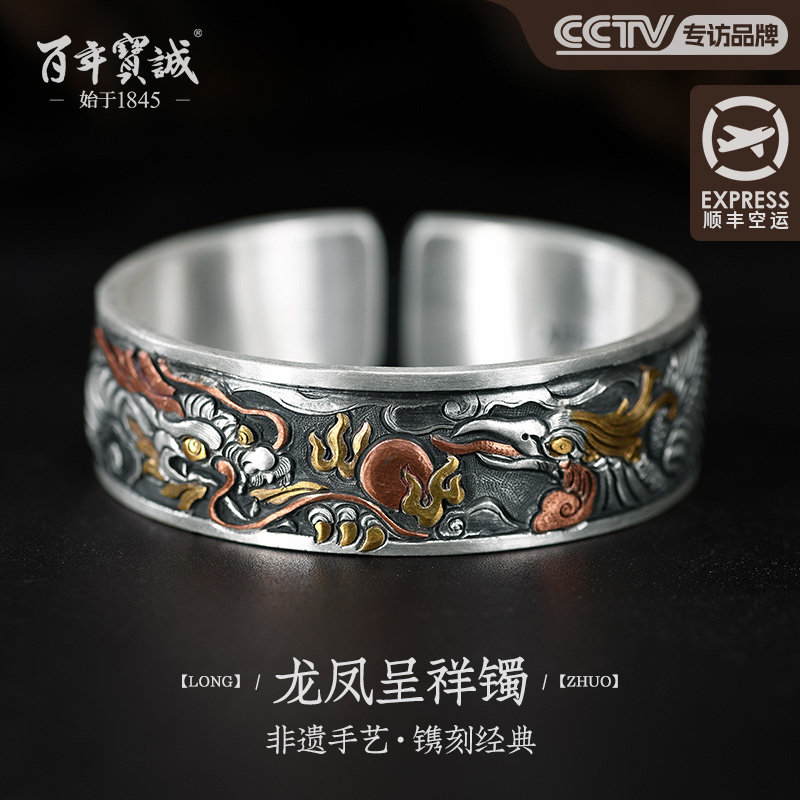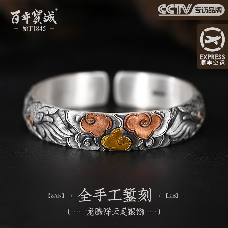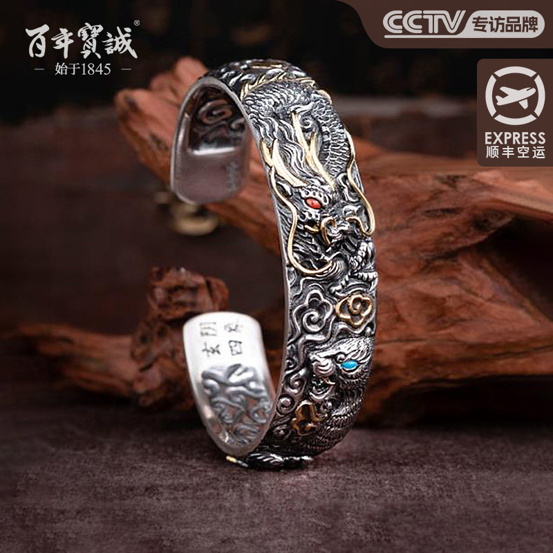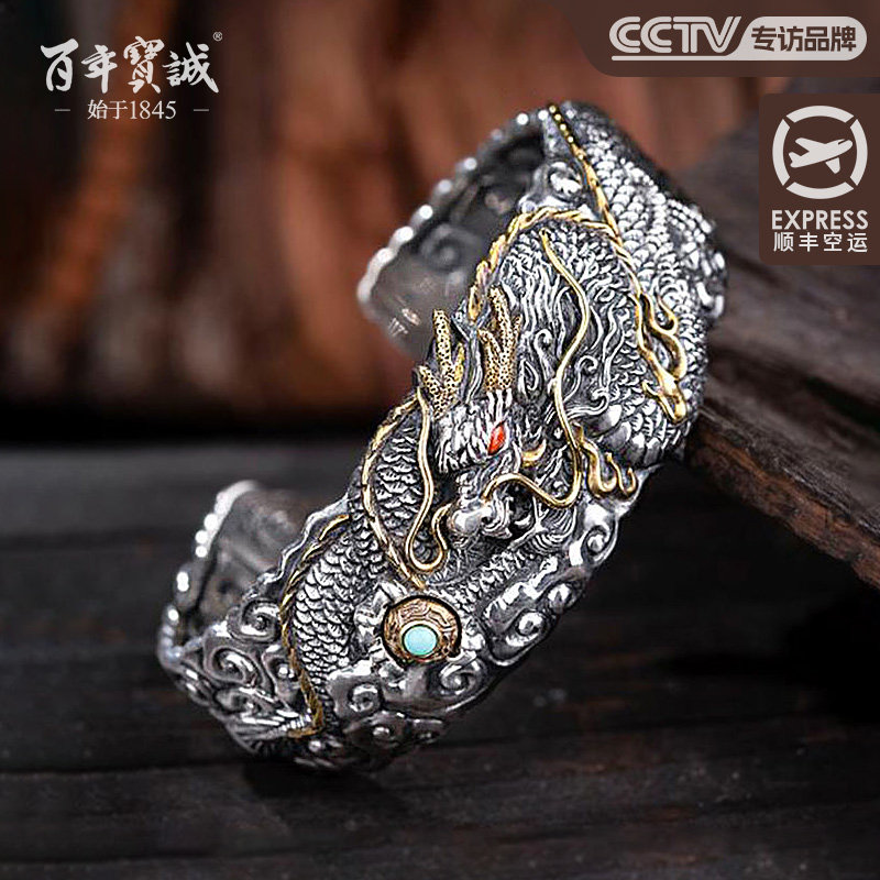 百年宝诚男士银手镯龙翔九天霸气夸张潮纯手工重工镯子个性复古风