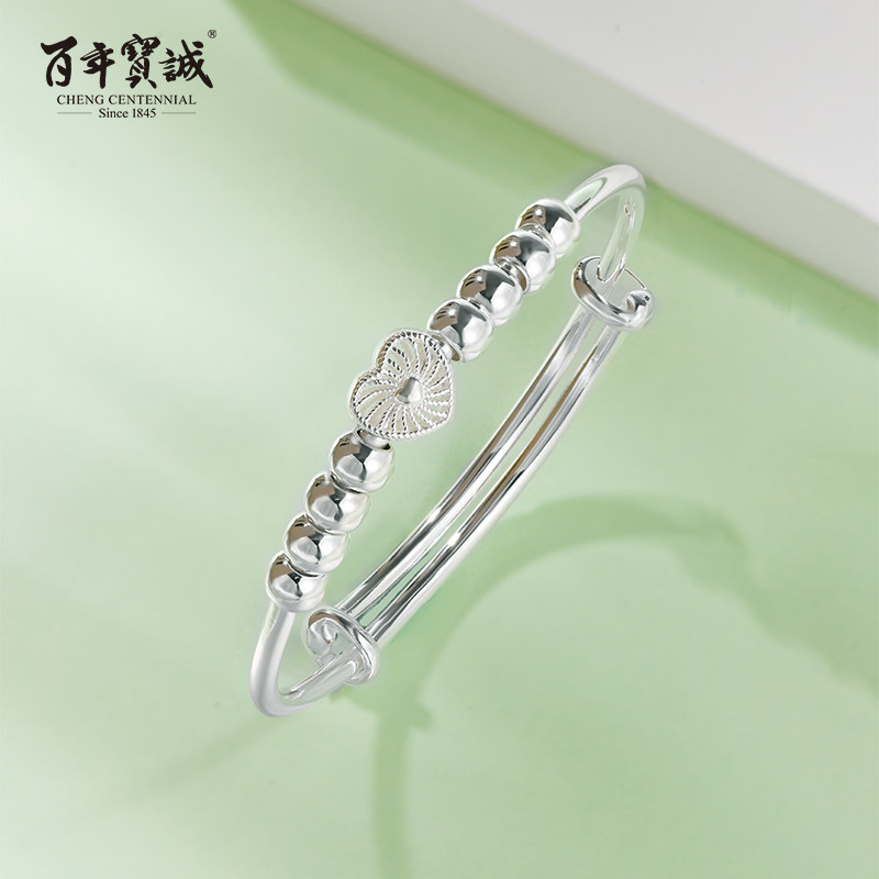 百年宝诚花丝镂空爱心圆珠银手镯999足银走马圈可调节时尚银镯子