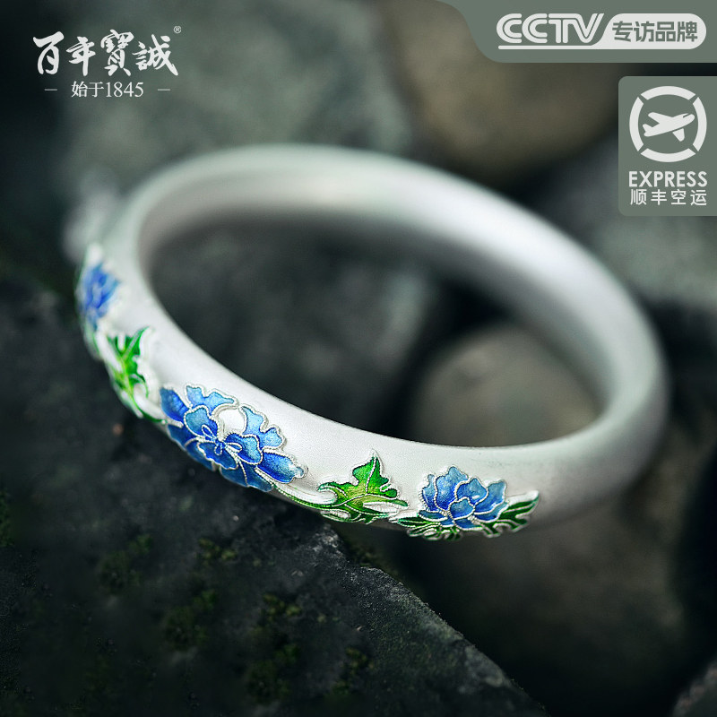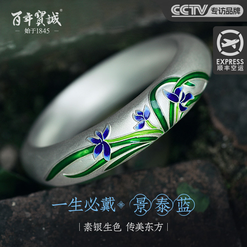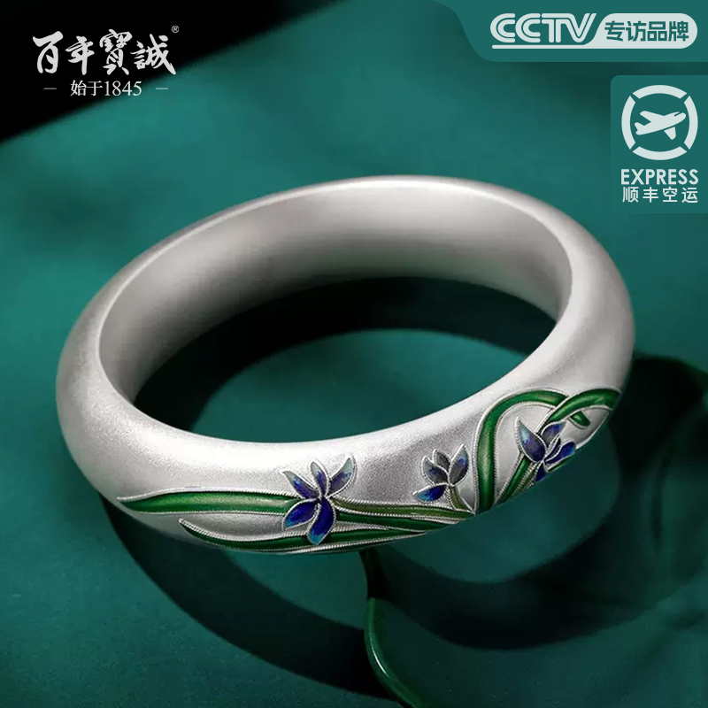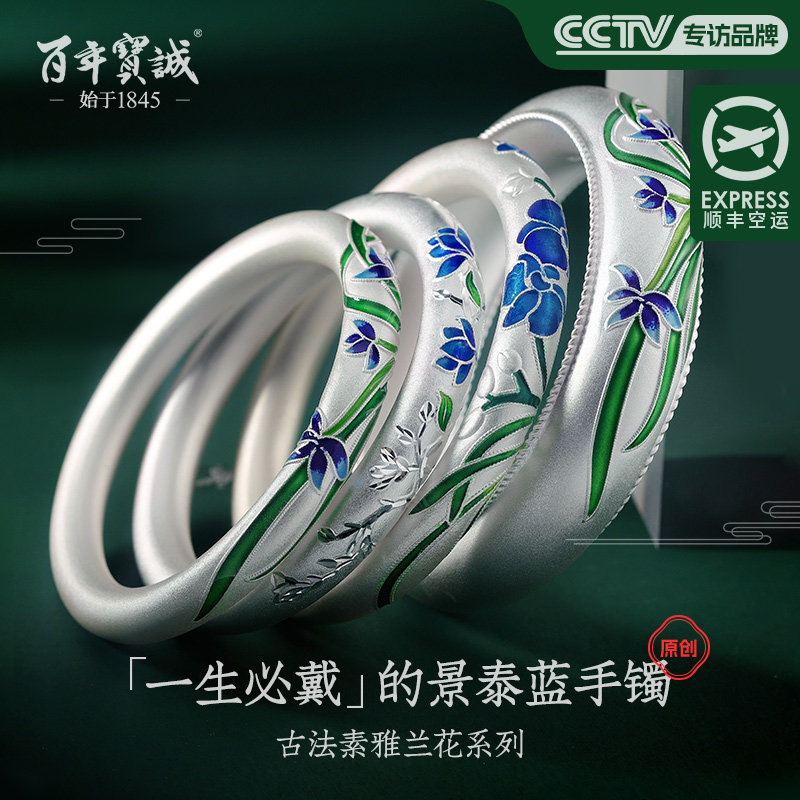 非遗景泰蓝纯银手镯999纯银古法传承兰花银手镯珐琅彩磨砂银手环