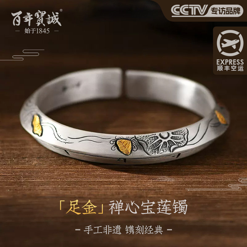 纯银手镯女款999足银镶足金禅心宝莲镯手工錾刻实心小众传承镯子