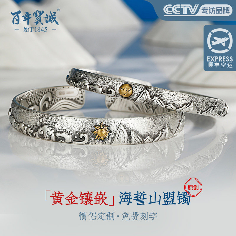 情侣银手镯999纯银海誓山盟镶24K金纯银手镯錾刻情人节送女友礼物