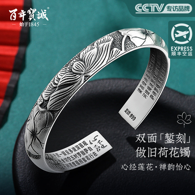 莲花心经纯银手镯999足银复古做旧荷花民族风开口银饰手环银镯子