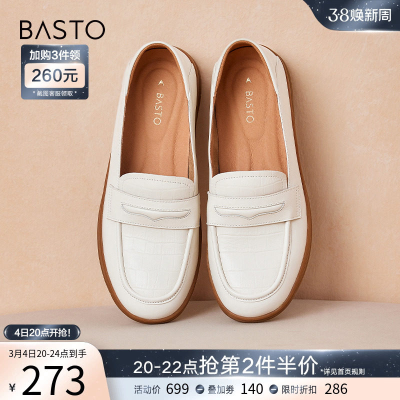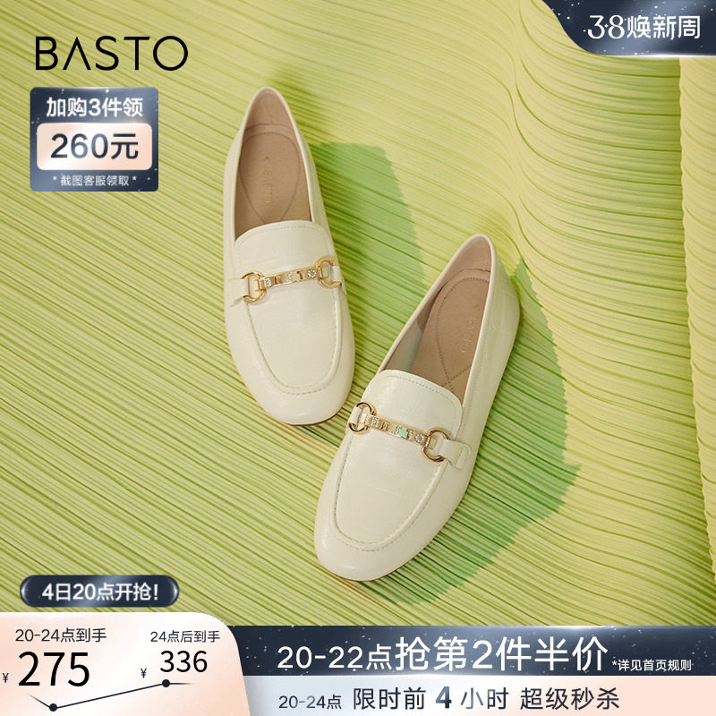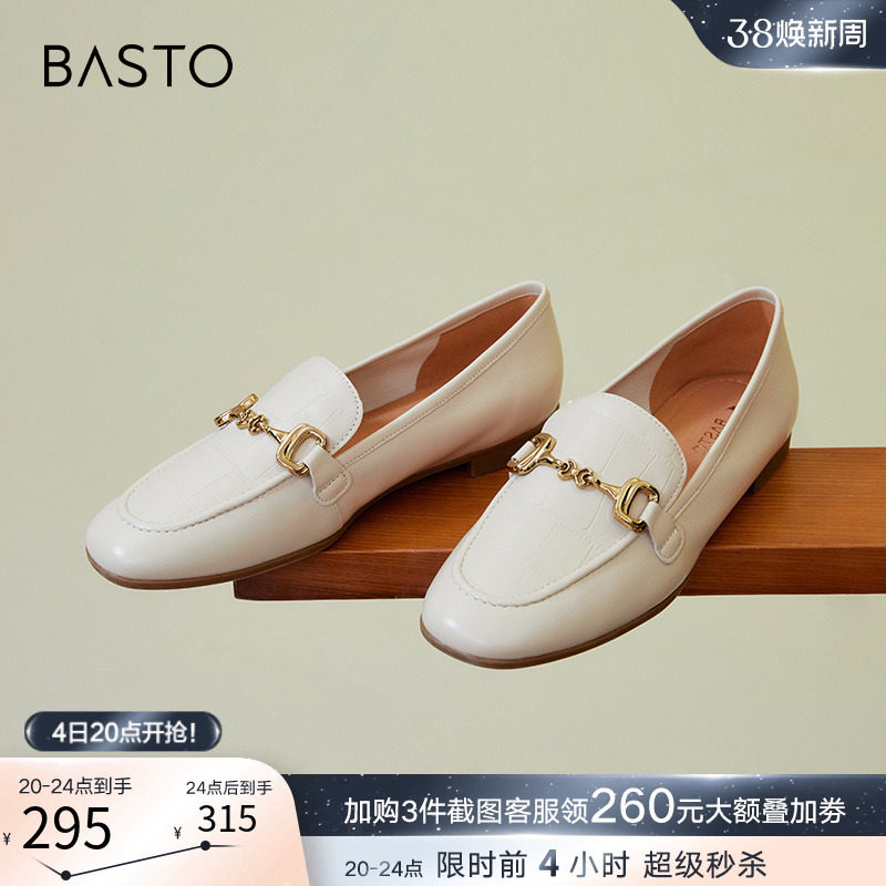 百思图2024春商场新款真皮法式白色乐福鞋小皮鞋女单鞋TQ422AA4