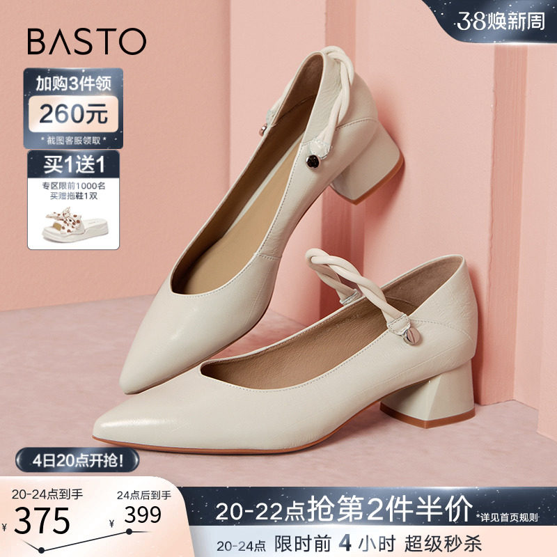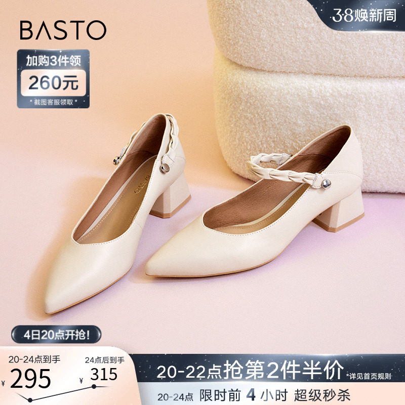 百思图2024春商场新款简约尖头玛丽珍鞋小皮鞋粗跟女单鞋RU845AQ4