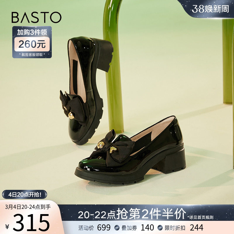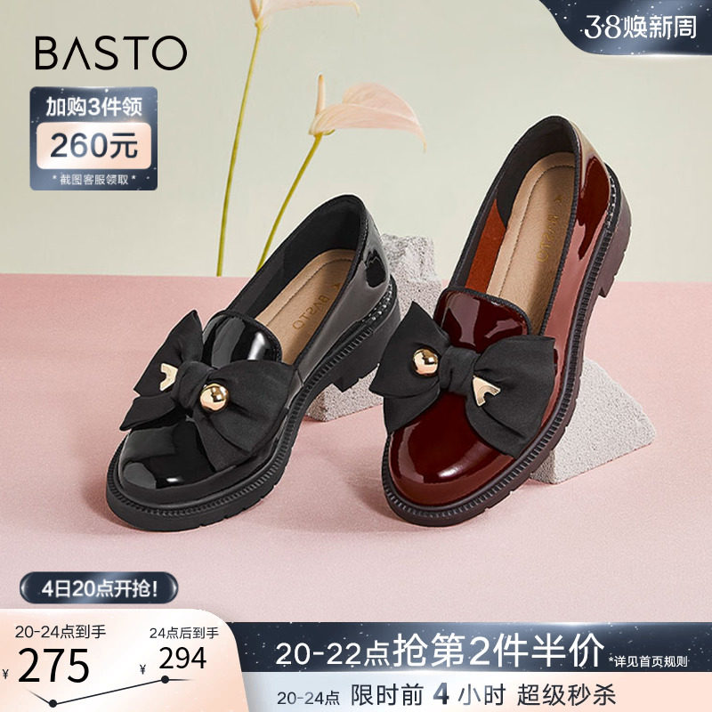 百思图春季商场新款英伦风蝴蝶结黑色乐福鞋小皮鞋女单鞋TIF52AA3
