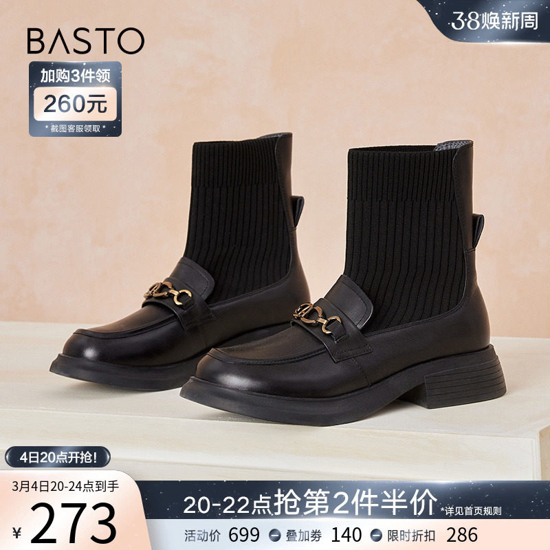 百思图23冬季商场新款学院风乐福小皮鞋连袜瘦瘦靴女短靴VSE01DD3