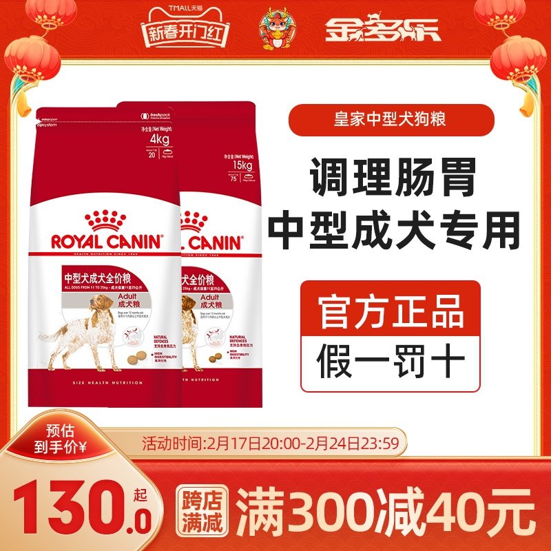 皇家狗粮中型成犬粮M25/4/15KG金毛罗威纳萨摩耶边牧柯基通用犬粮