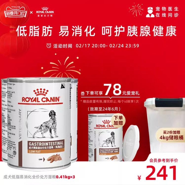 【顺丰发货】皇家狗粮肠胃处方湿粮低脂肪慕斯肉泥VGLFLC/410g*3