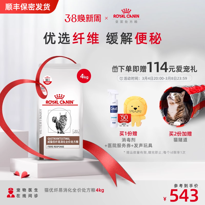【顺丰包邮】皇家猫粮成猫优纤易消化处方粮FR31便秘4KG猫主粮