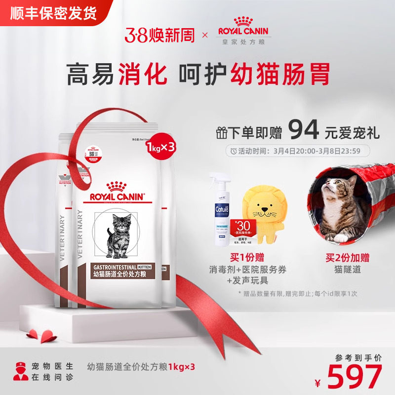 【顺丰发货】皇家猫粮幼猫肠道处方粮GIK35/1KG*3猫粮呵护肠道