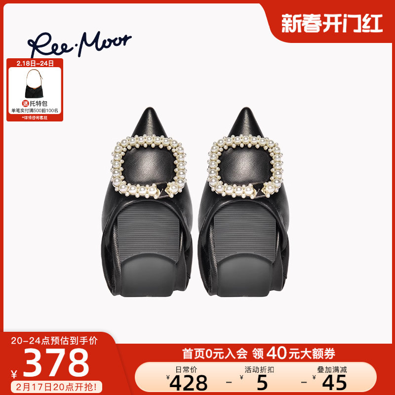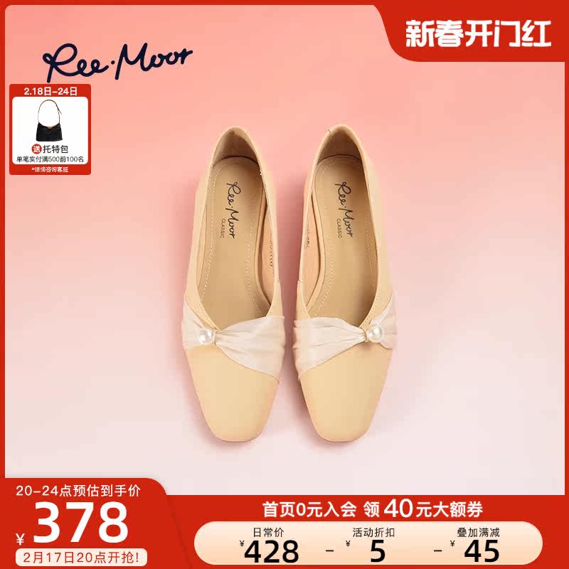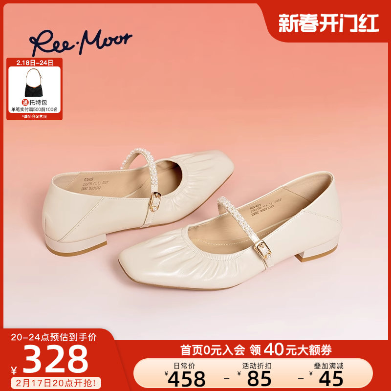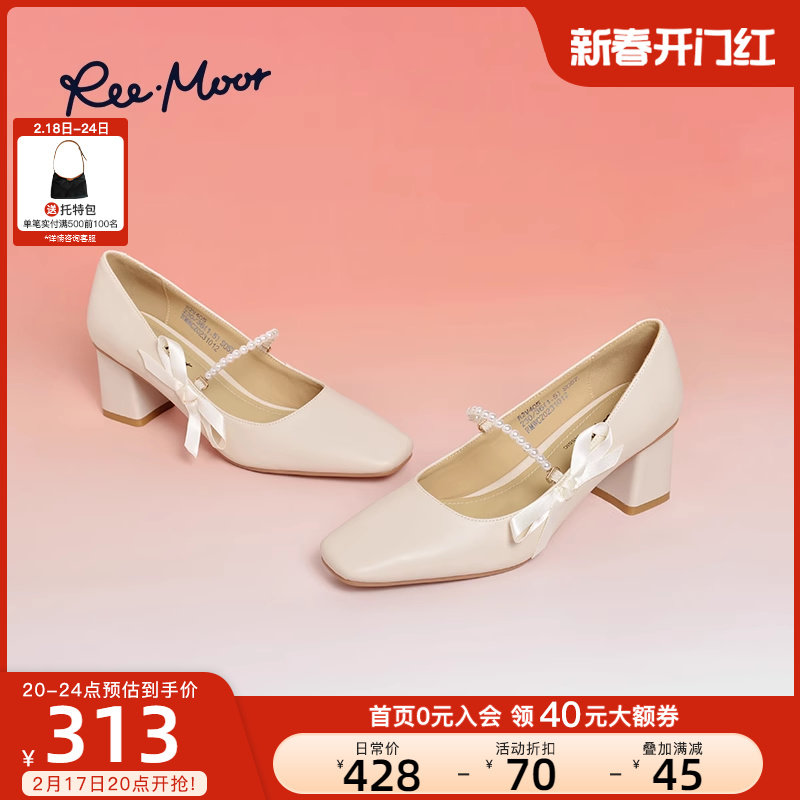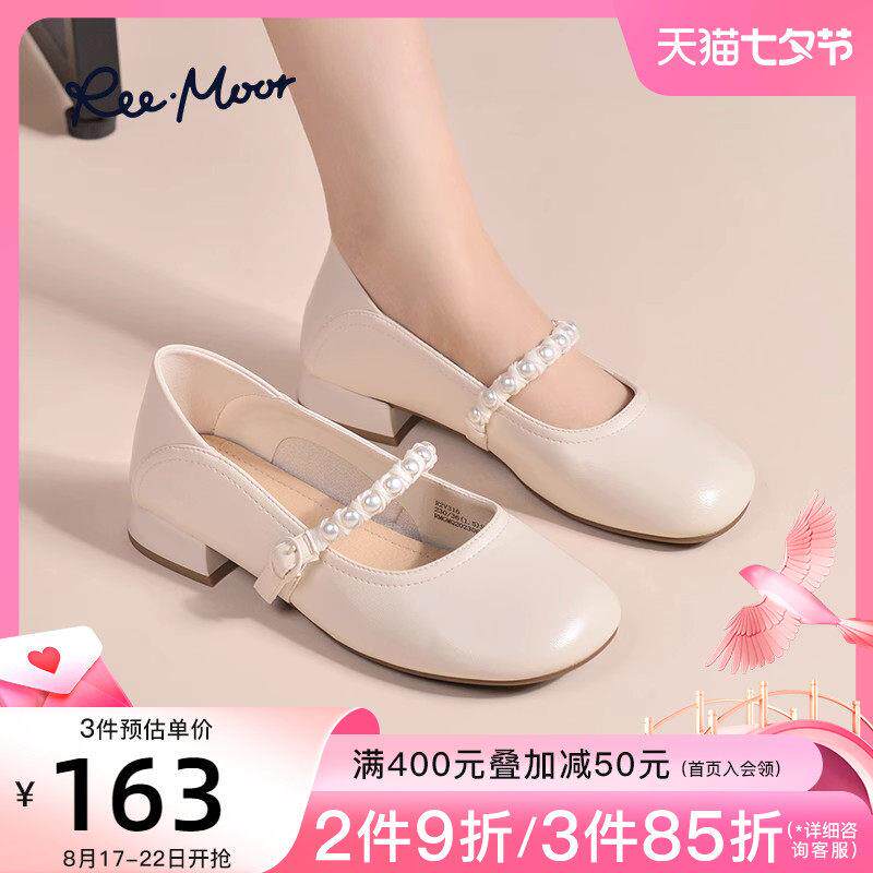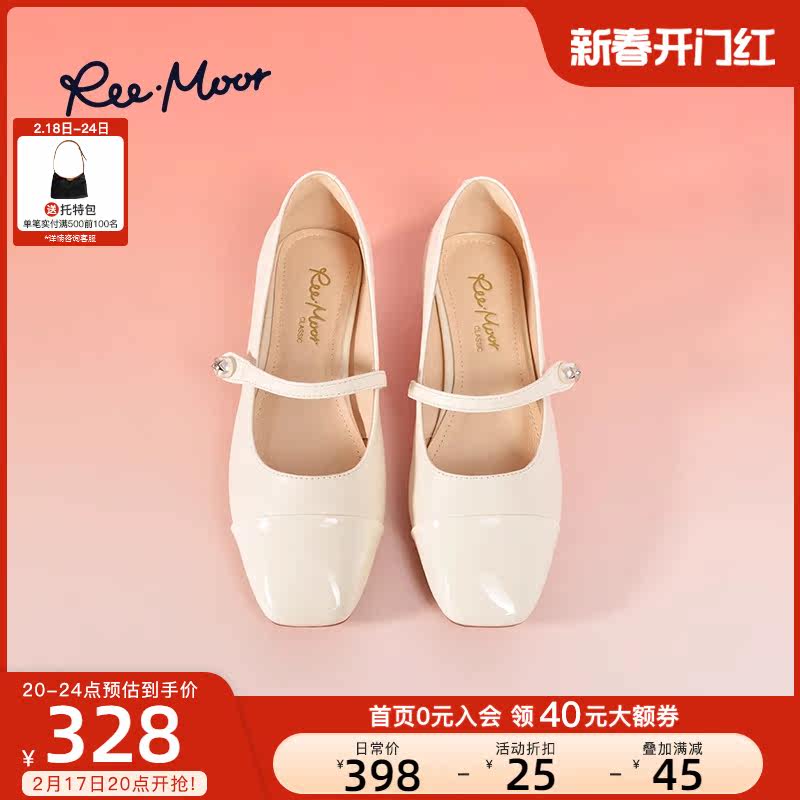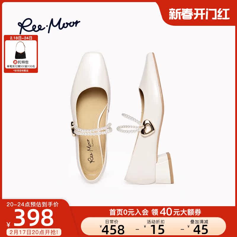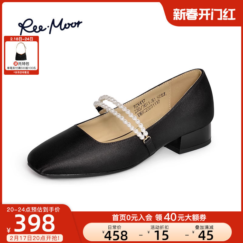 REEMOOR睿慕2024年春新款粗跟玛丽珍鞋气质浅口单鞋女一字珍珠扣