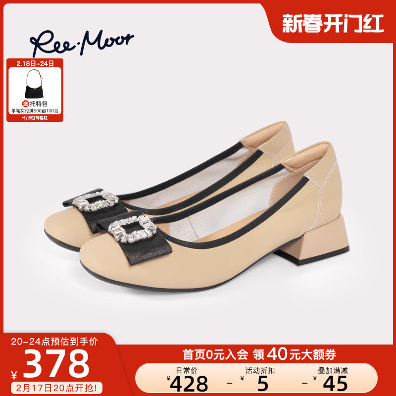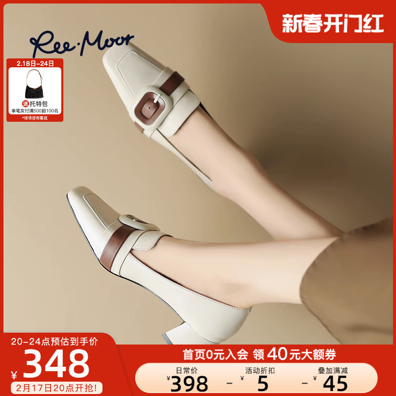 REEMOOR睿慕2024年春季新款圆头羊皮浅口单鞋方扣粗跟玛丽珍鞋女