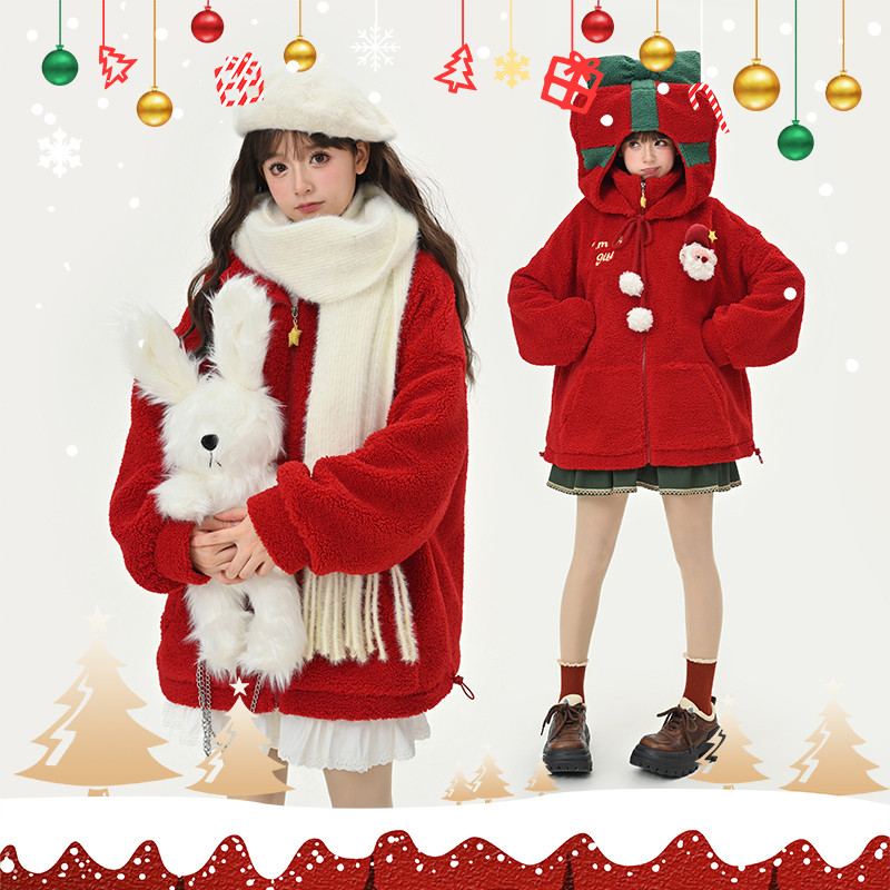 森女部落原创中国红绒衫显白喜庆过年卫衣外套女连帽财神帽设计感