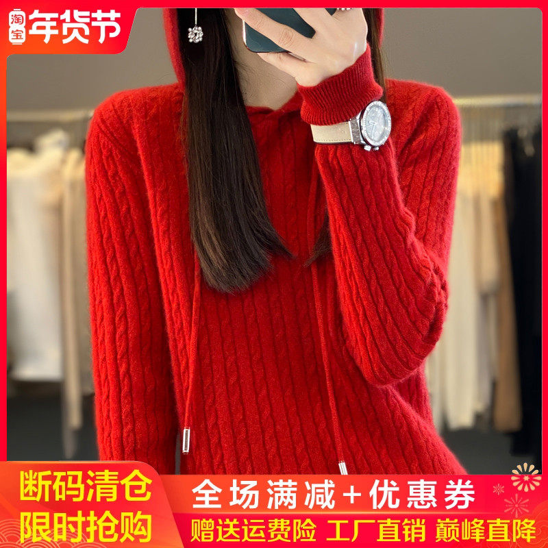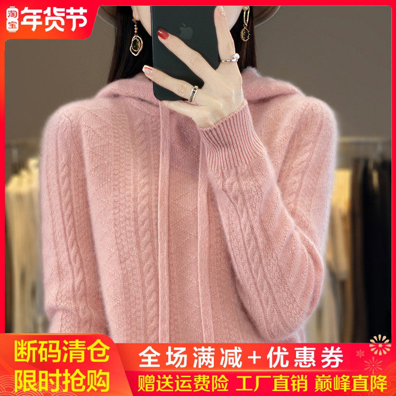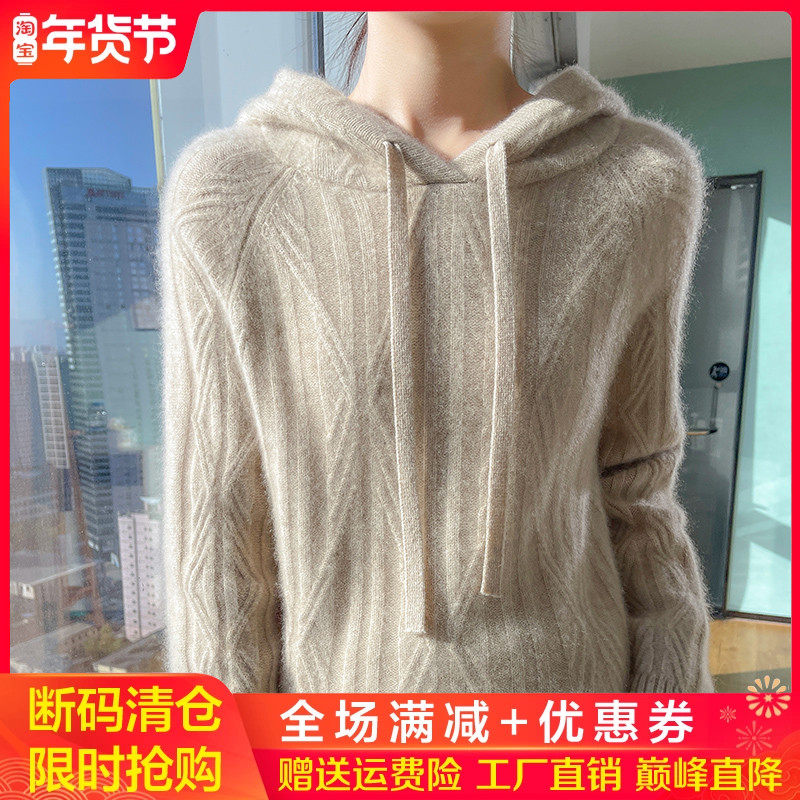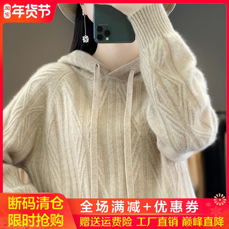 100%纯羊绒衫女连帽绞花加厚长袖针织毛衣宽松慵懒风羊毛打底卫衣