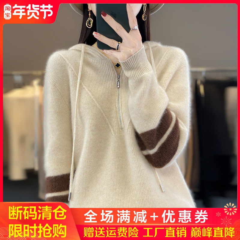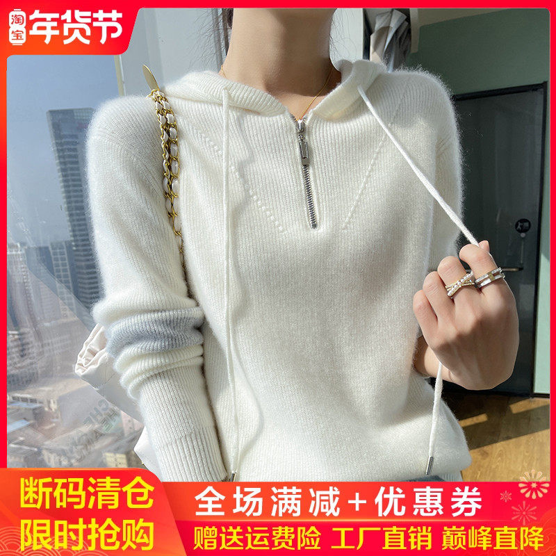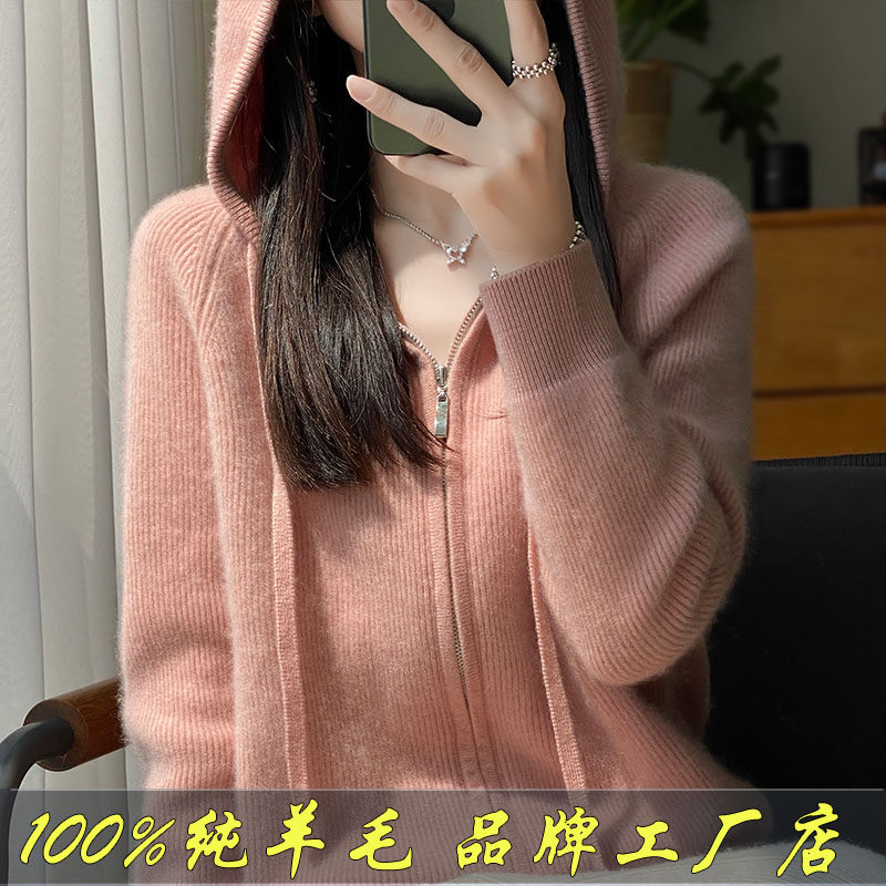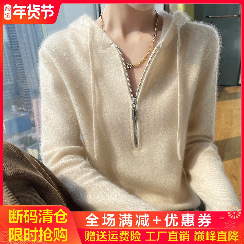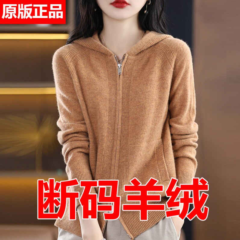 太实穿了~重磅加厚!山羊绒衫女连帽卫衣拉链开衫纯羊绒毛衣外套