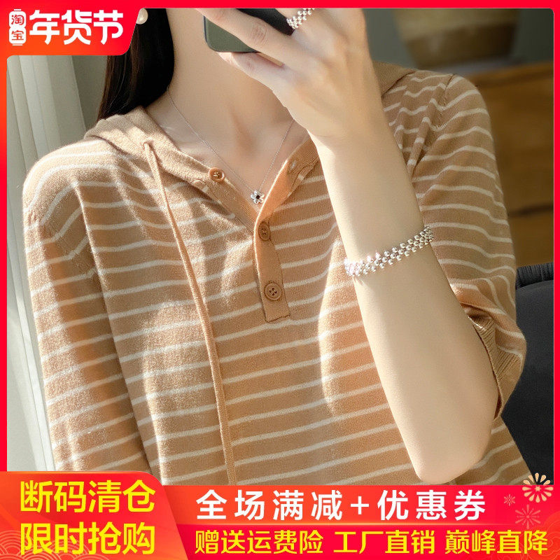 反季清仓秋冬羊绒衫女套头宽松大码毛衣连帽卫衣条纹打底针织帽衫