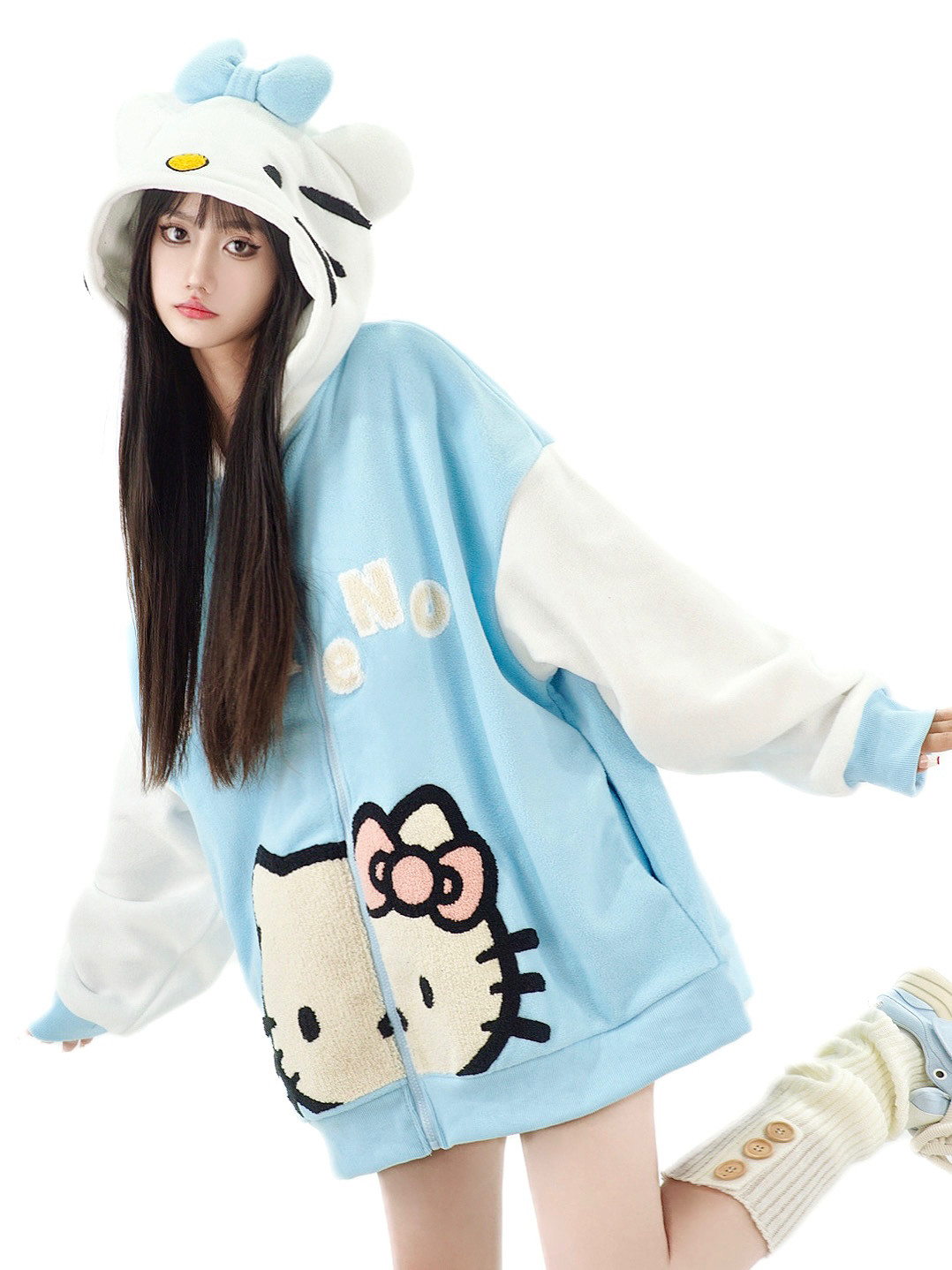 Amoeba可爱凯蒂猫摇粒绒连帽卫衣拉链外套开衫女宽松搞怪秋冬绒衫