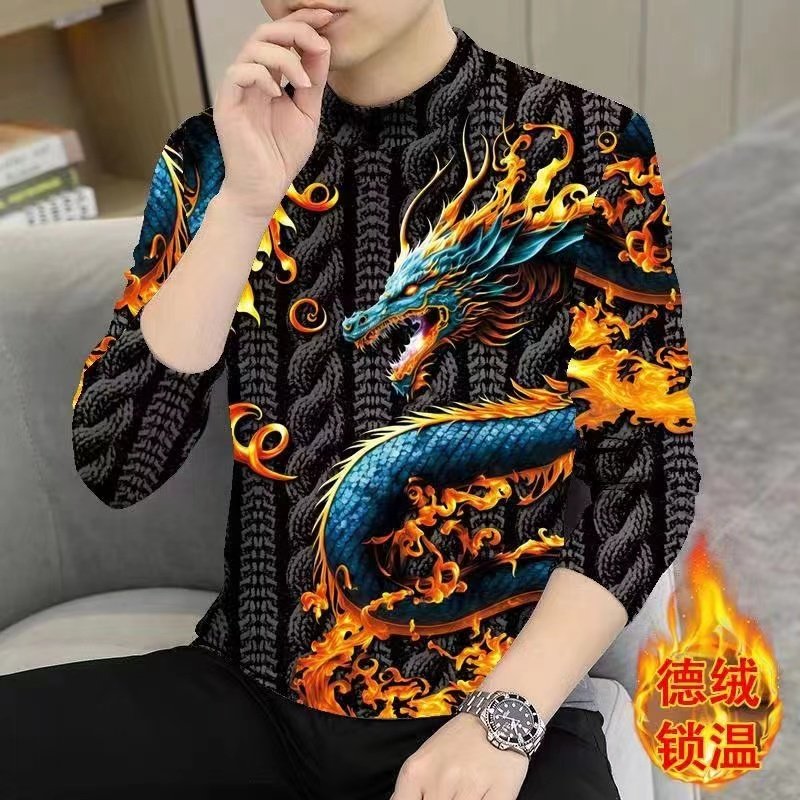 欧货2023秋冬新款高端男士圆领卫衣修身休闲轻奢霸气过肩金龙绒衫