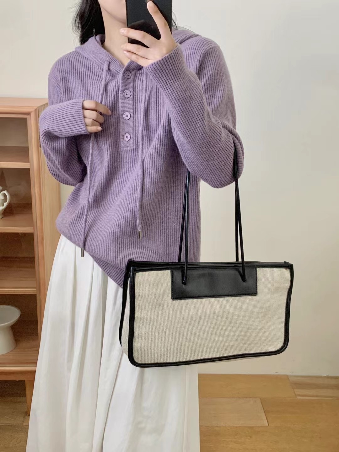 秋冬连帽撞色100%羊绒衫长袖卫衣女宽松带帽慵懒羊毛针织打底帽衫