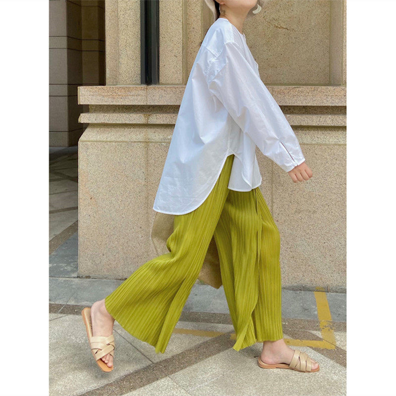 绿色褶皱裤子女薄款防晒裤夏季宽松阔腿裤百褶裤冰丝凉凉裤抖抖裤