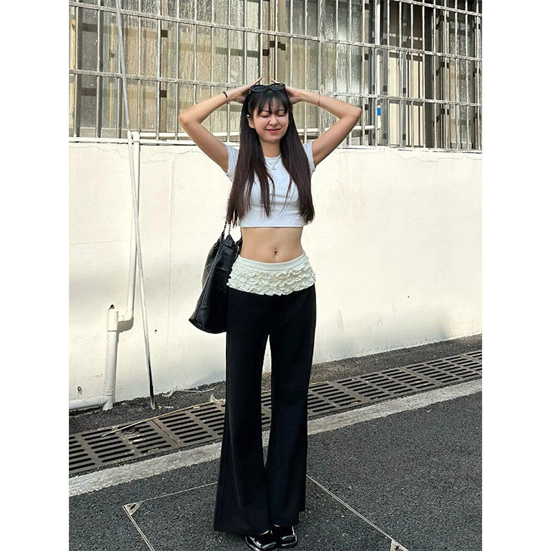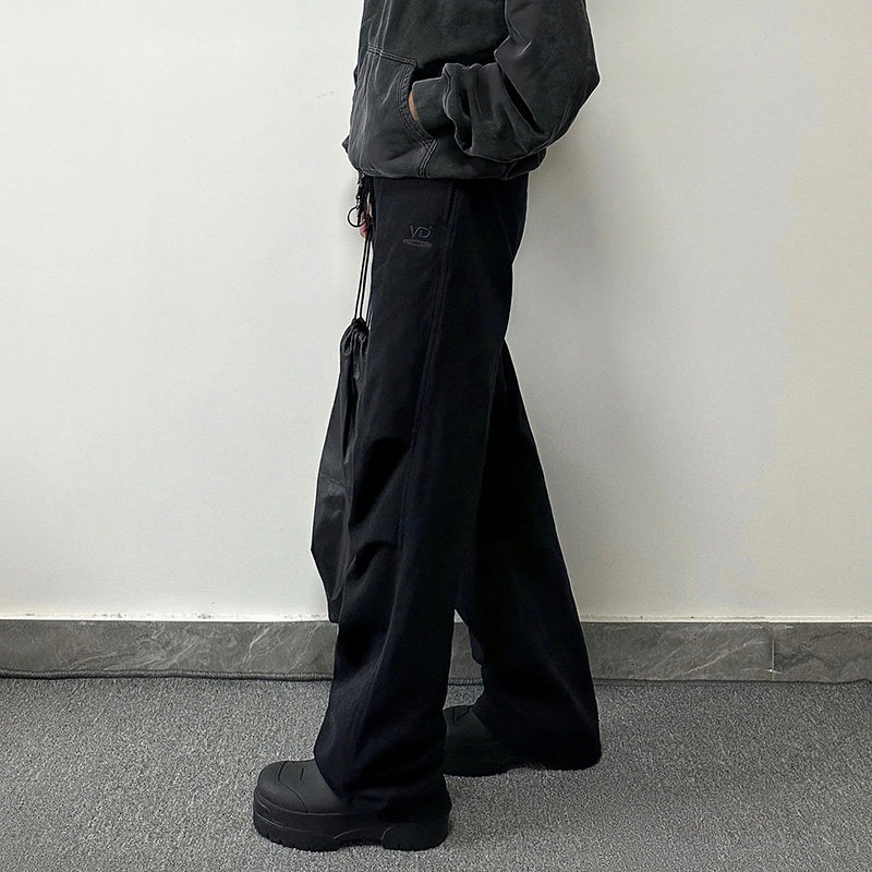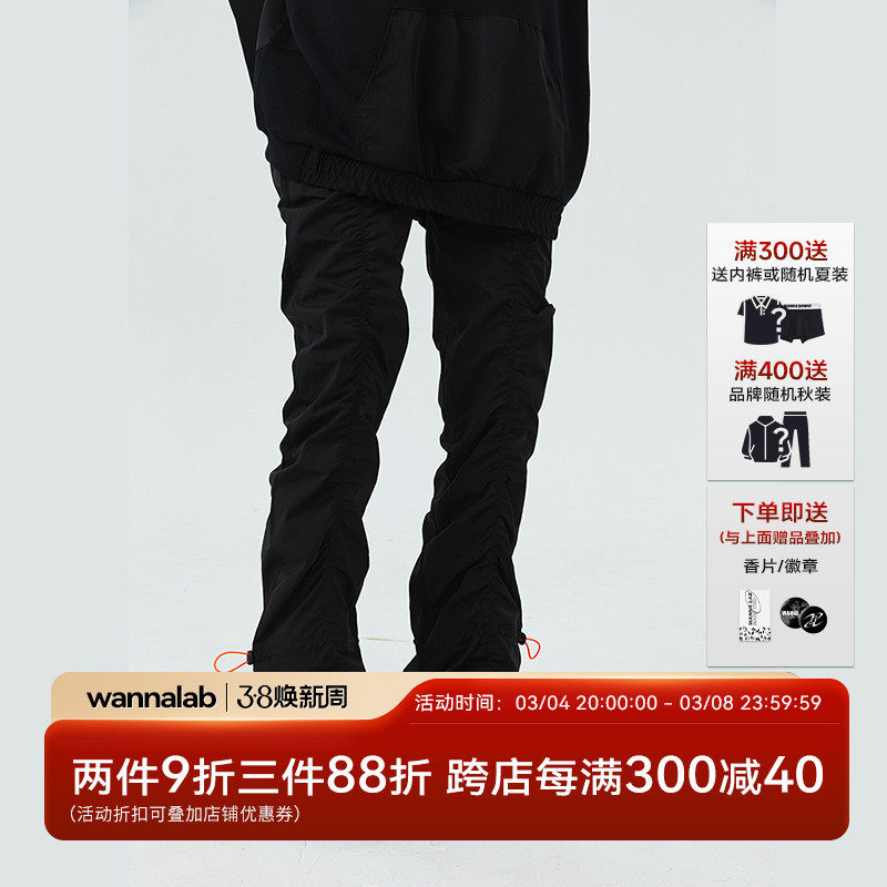 WANNALAB cleanfit美式抽绳褶皱堆积感长裤 高街vibe黑色微喇叭裤