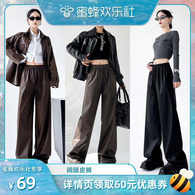 【蜜蜂欢乐社】魅织阔腿皮裤女垂感PU皮哑光褶皱高级感直筒阔腿裤