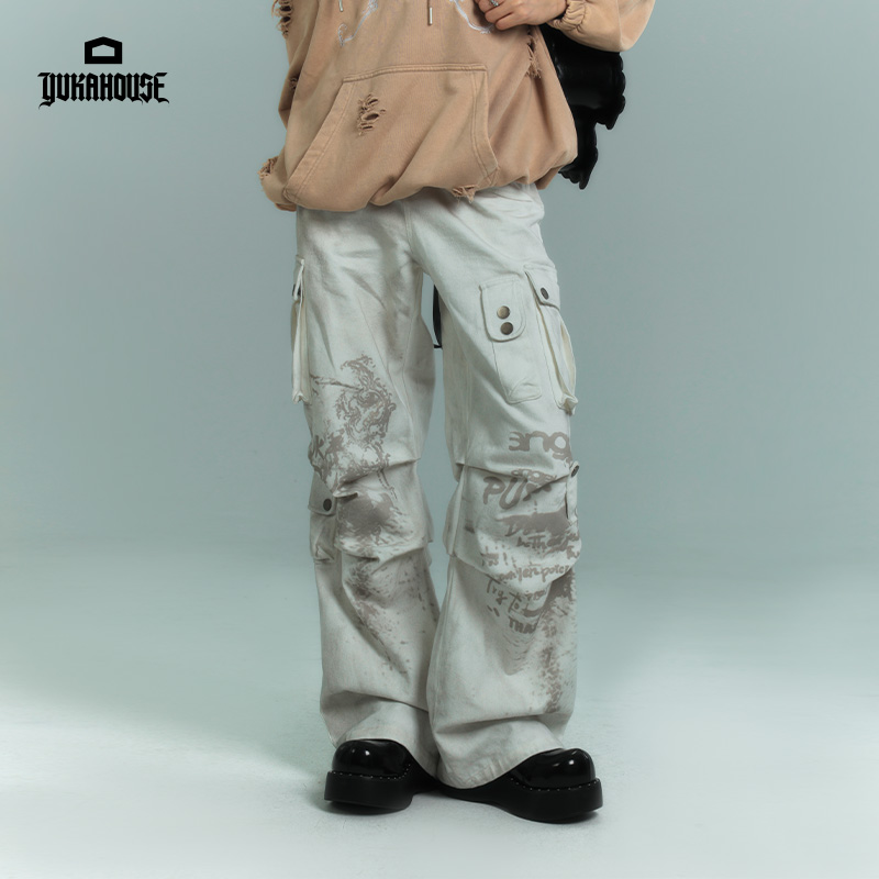 YUKAHOUSE 米白色脏洗褶皱牛仔裤高街多口袋阔腿长裤休闲裤春冬款