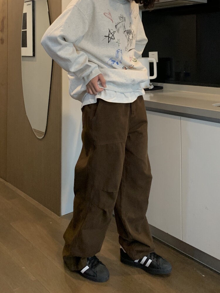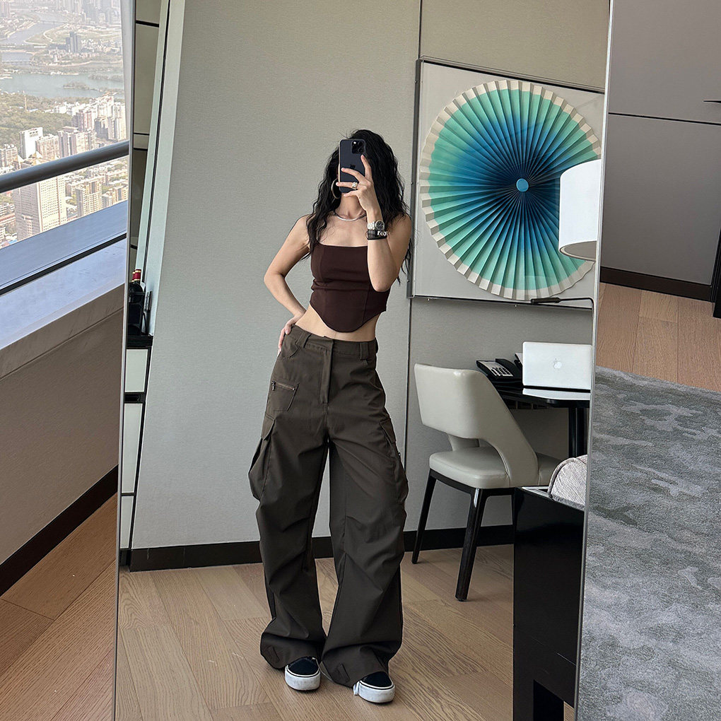 DQSTORE美式复古棕设计感褶皱多口袋工装裤女宽松休闲直筒阔腿裤