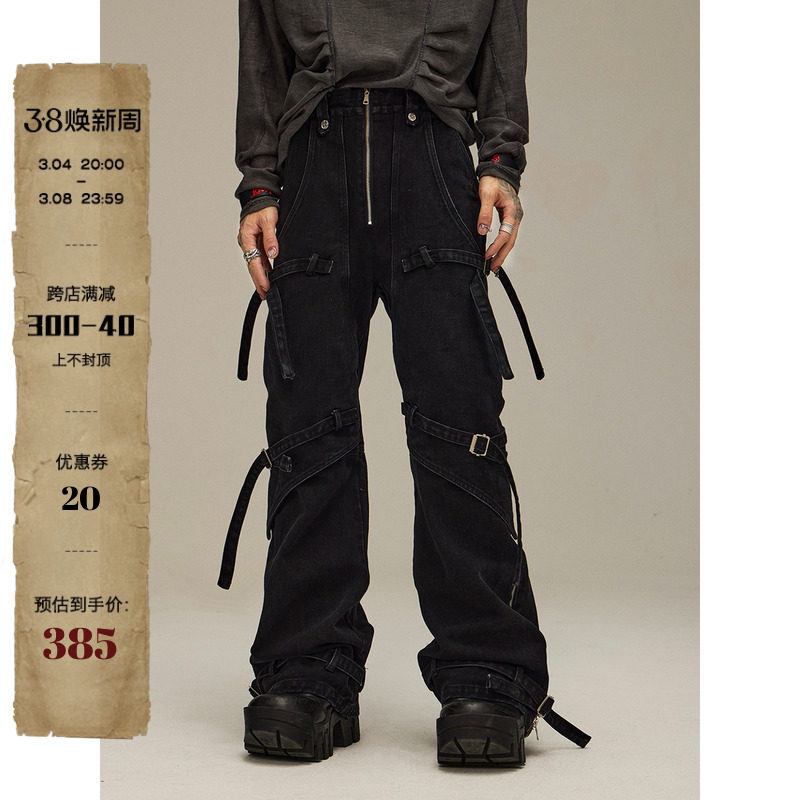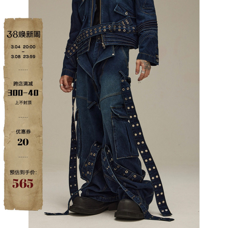FLYERRER 23FW重工设计感褶皱拼接工装五金装饰宽松垂感牛仔裤