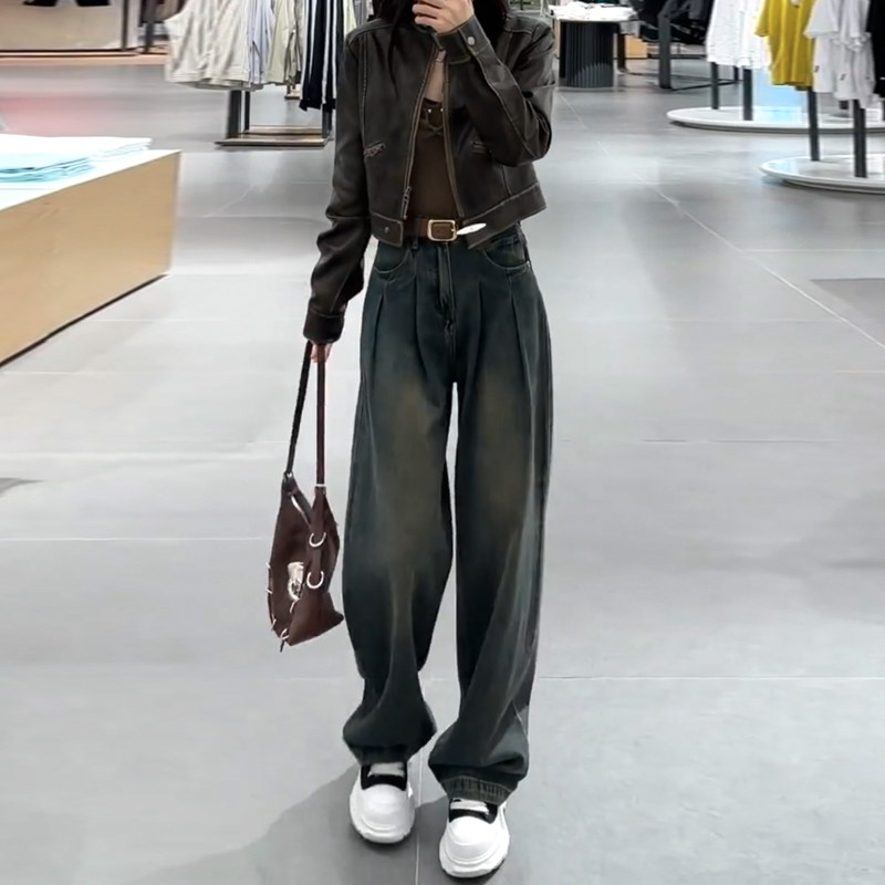 水泥灰阔腿牛仔裤女2024年春季新款美式褶皱高腰垂感小个子拖地裤