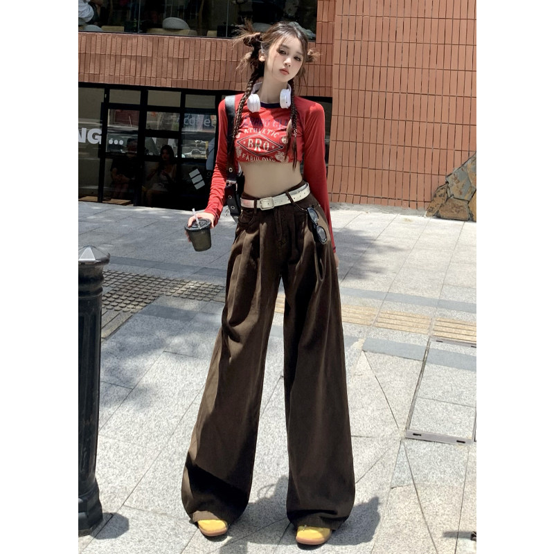 KRO深咖色休闲牛仔裤女2024褶皱设计秋季宽松显瘦高腰阔腿拖地裤