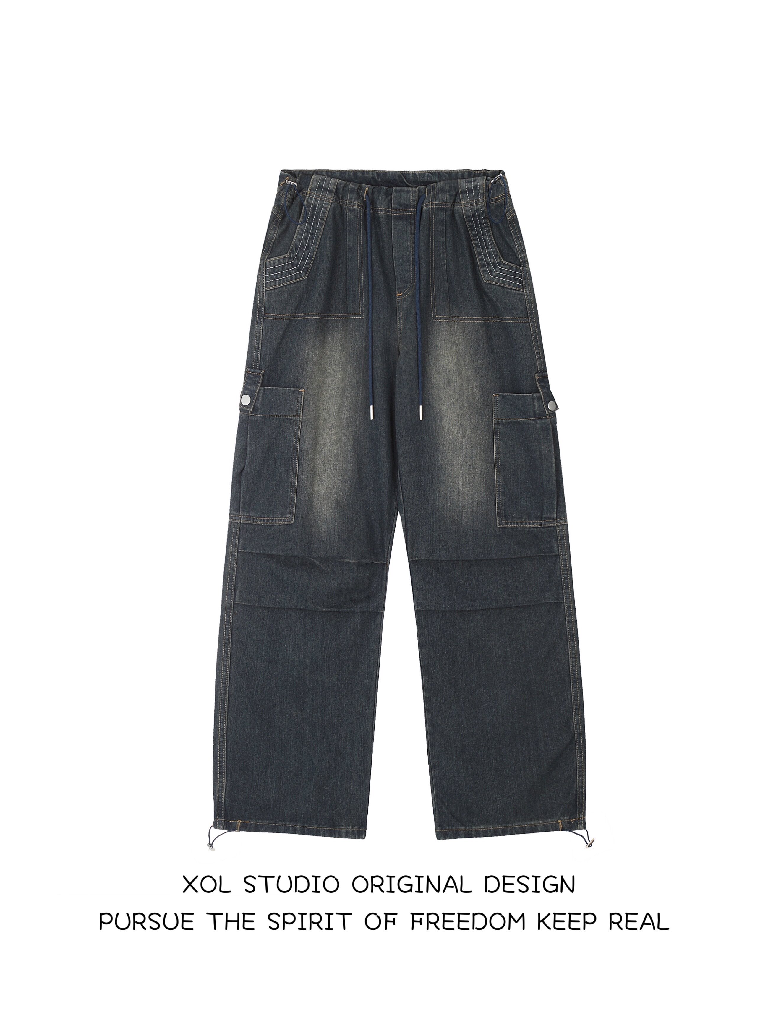 XOL 美式hiphop褶皱多口袋工装牛仔裤男女宽松潮牌直筒阔腿长裤