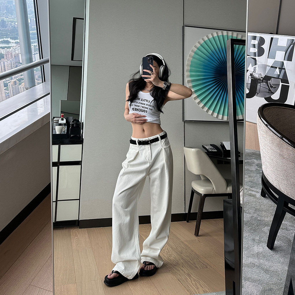 DQSTORE白色褶皱牛仔裤女夏季新款高腰直筒垂感高级感拖地阔腿裤