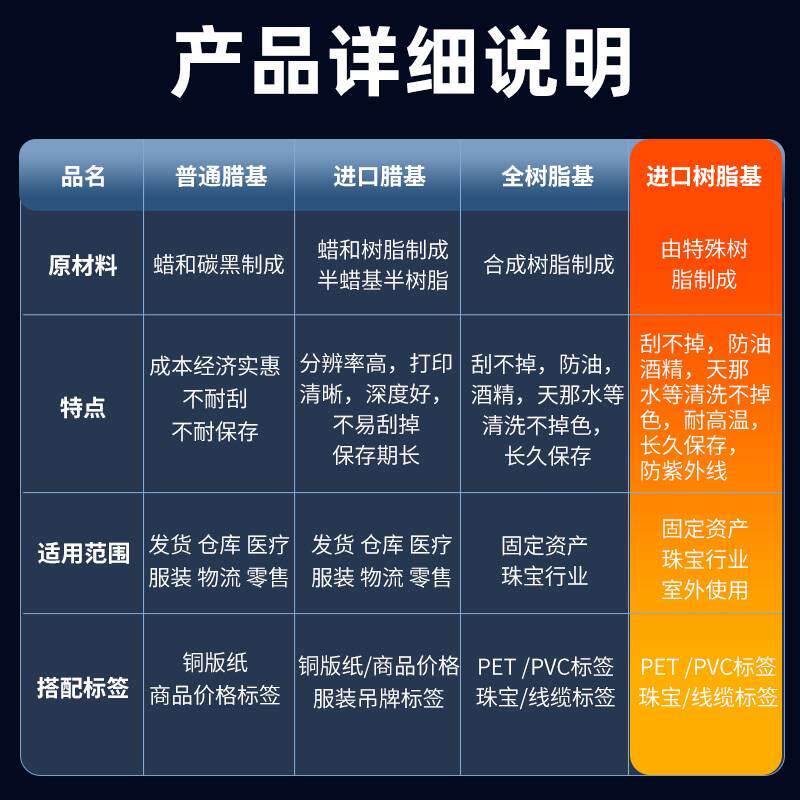 进口全树脂基碳带40-110mm*300m米斑马立象科诚TSC条码打印机色带
