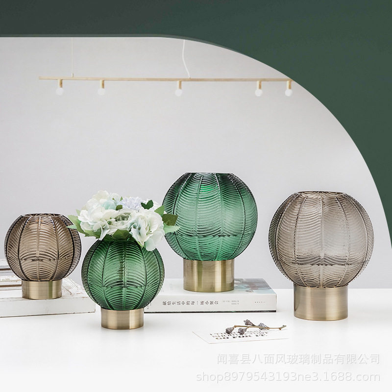 现货直发欧式金属铜圈人工吹制咖色圆球玻璃花瓶家居软装饰品