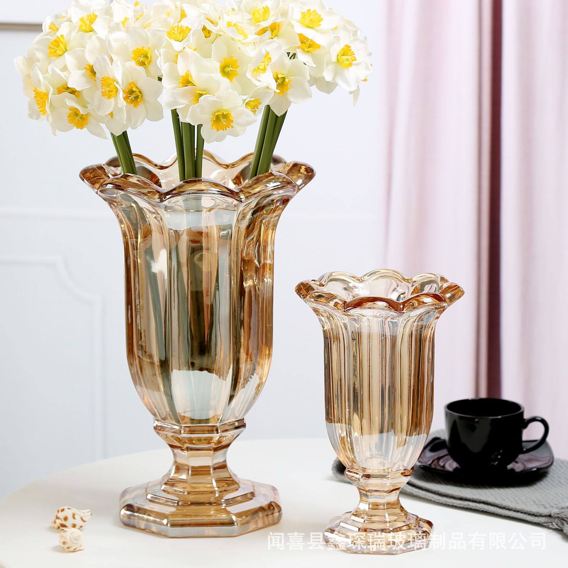 复古欧式新款浮雕玻璃花瓶高脚杯透明风灯电镀工艺品装饰 ins摆件