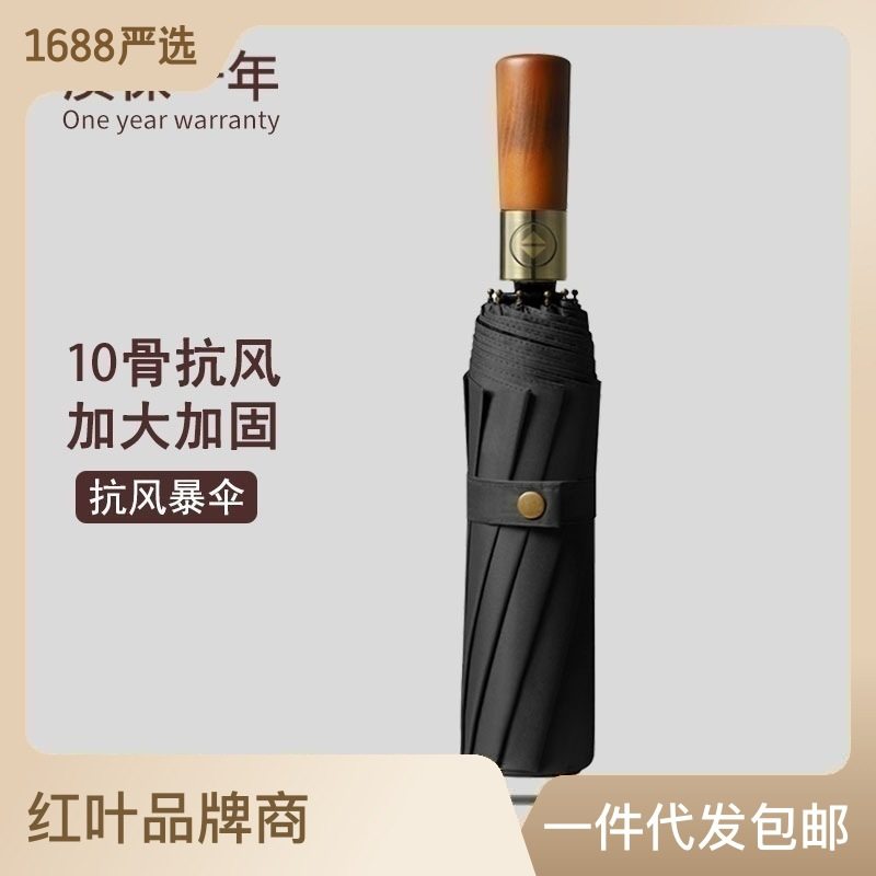 红叶伞新款全自动雨伞折叠木柄十骨防风加固晴雨黑胶伞遮阳伞