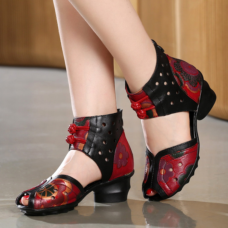 春夏镂空民族风妈妈鞋软底真皮单鞋女鞋高跟粗跟舞鞋红鞋凉鞋复古