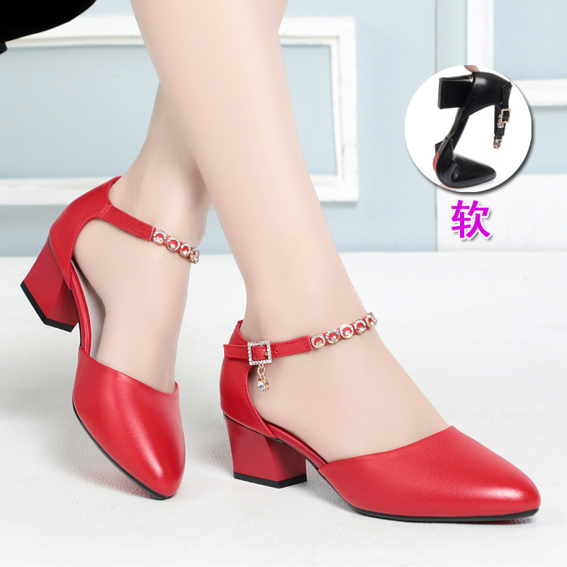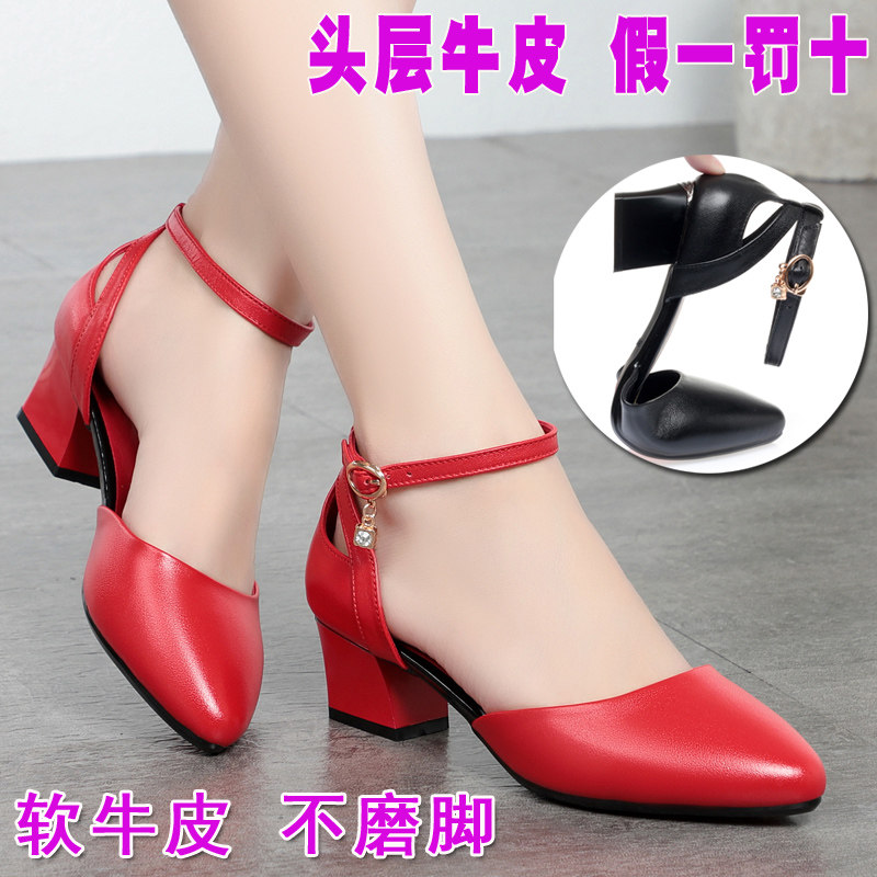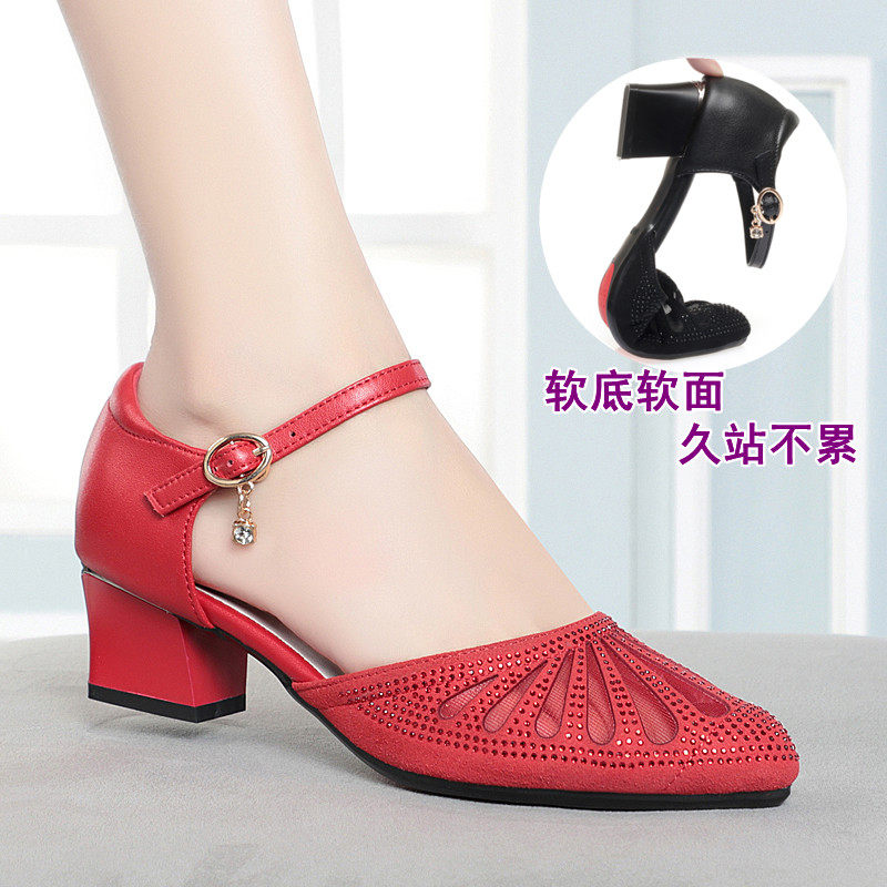 网纱真皮凉鞋新款红色镂空单鞋中跟粗跟妈妈软底跳舞鞋闰月女鞋