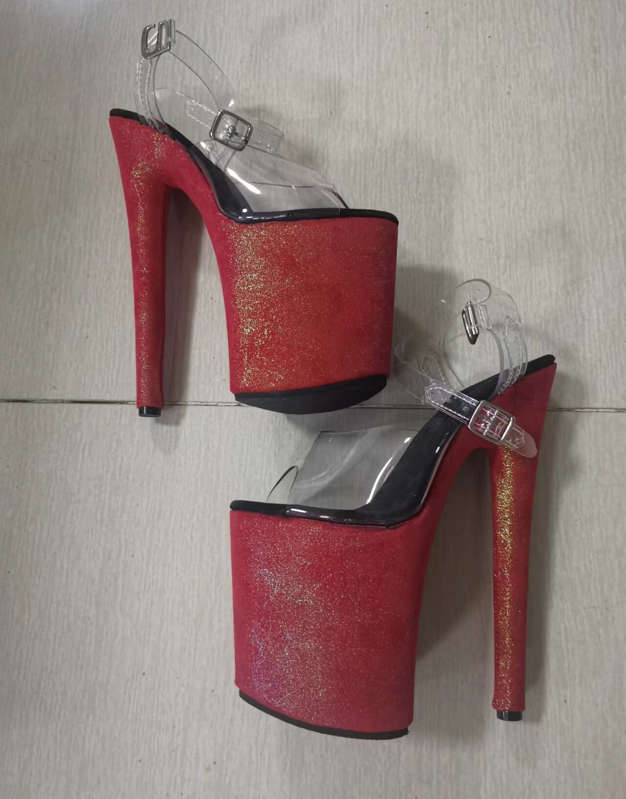 新款演出钢管舞鞋17cm20厘米模特走秀性感红色绒幻彩时尚高跟凉鞋