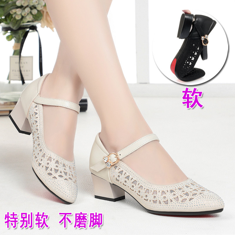 真皮女凉鞋新款网纱女鞋春夏季粗跟镂空透气跳舞鞋中年女士单鞋