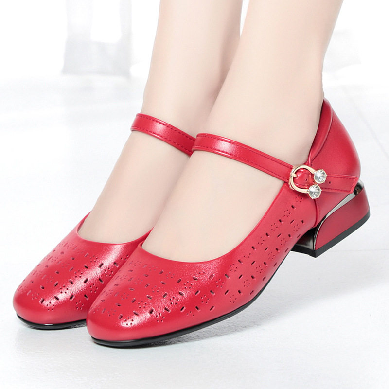 真皮凉鞋中空单鞋2021夏新款中跟软底女鞋中年妈妈跳舞鞋红色皮鞋