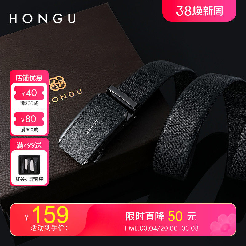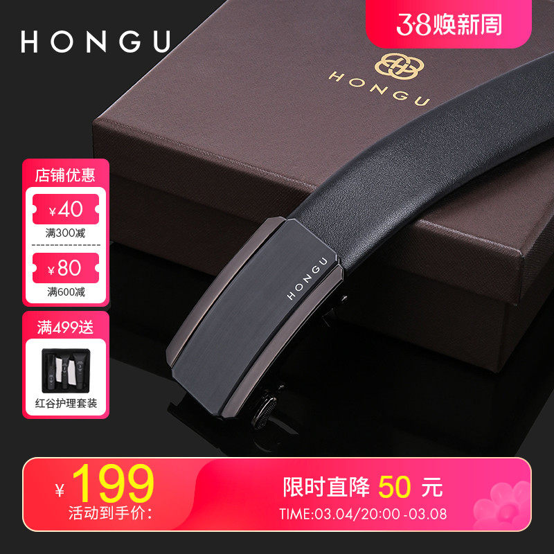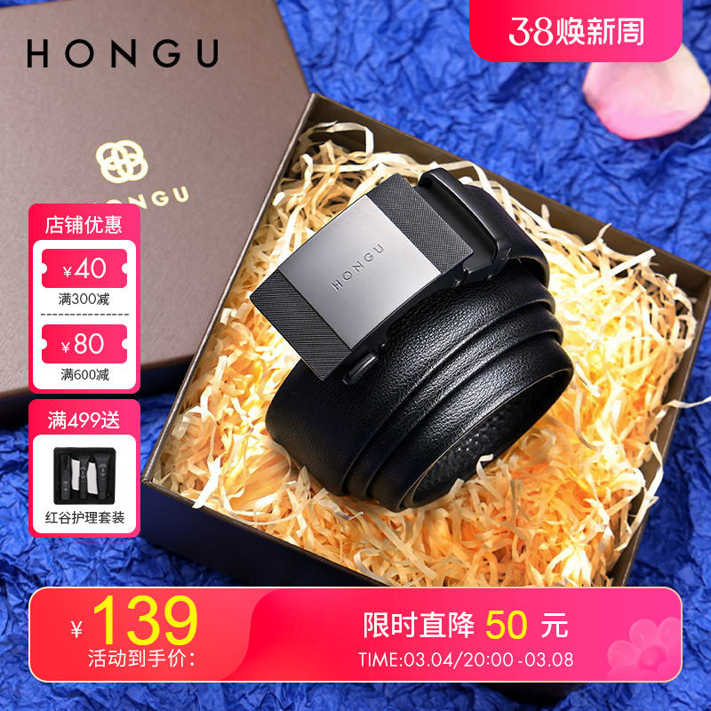 红谷2023新款男士时尚裤腰带礼盒商务自动扣皮带牛皮休闲腰带