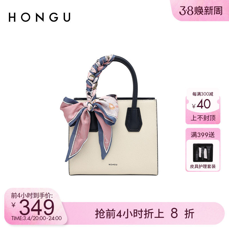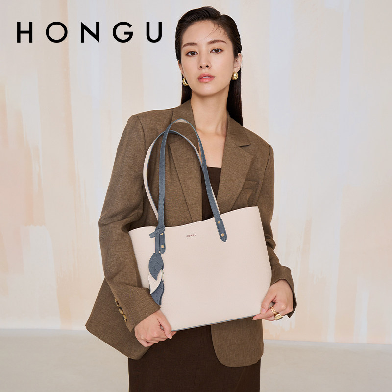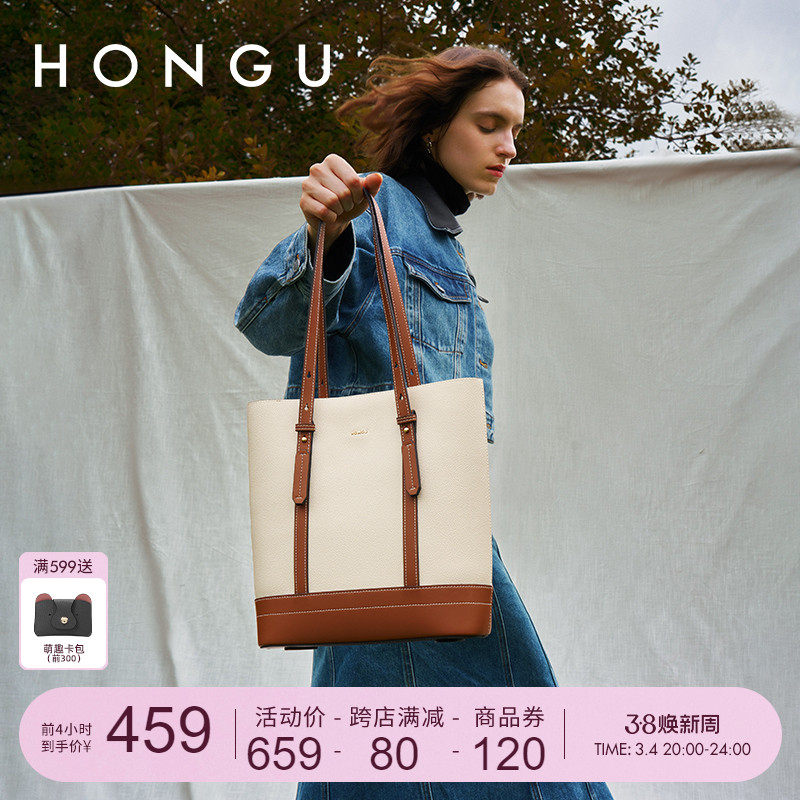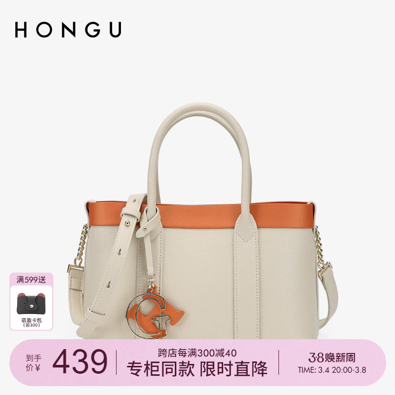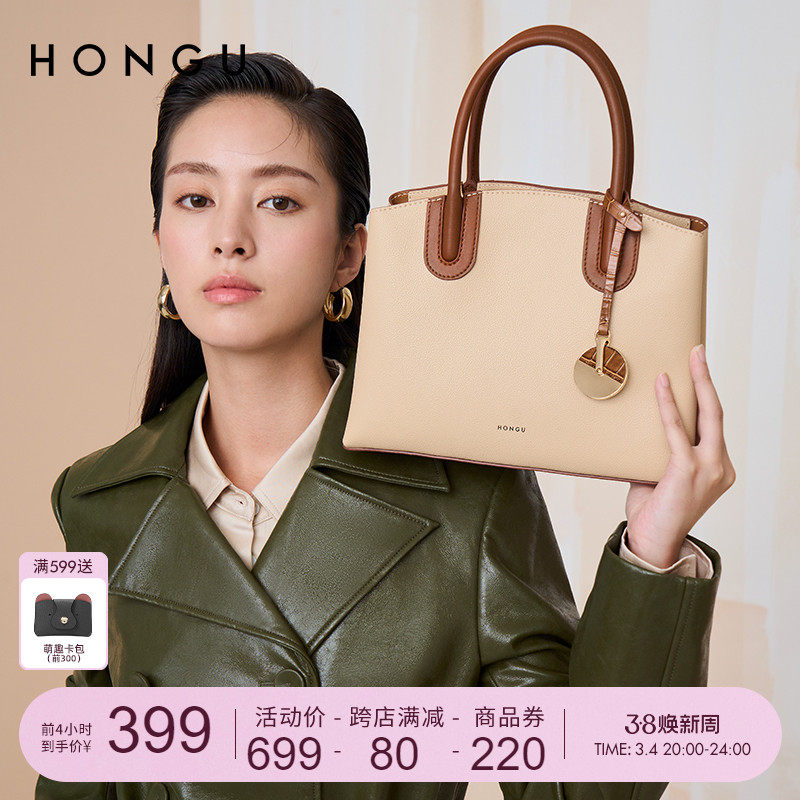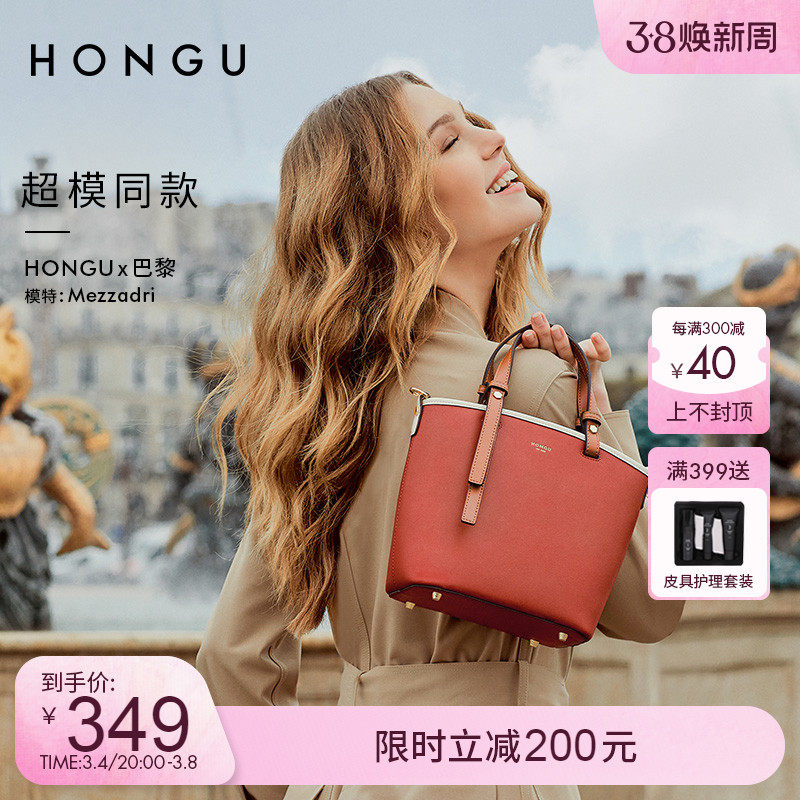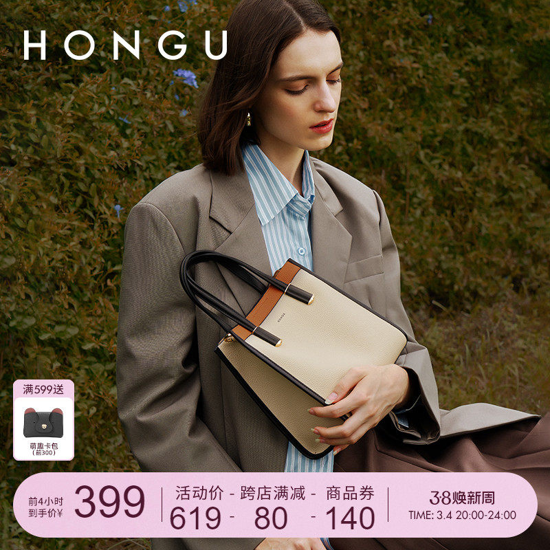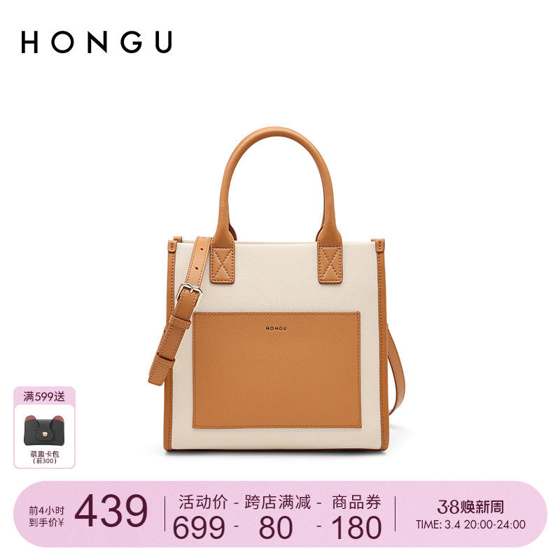 红谷包包2023新款通勤牛皮单肩手提包时尚撞色大容量手提袋女士包